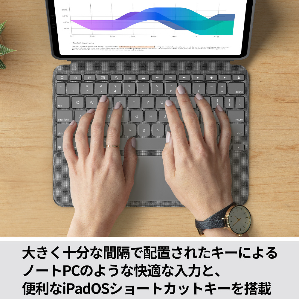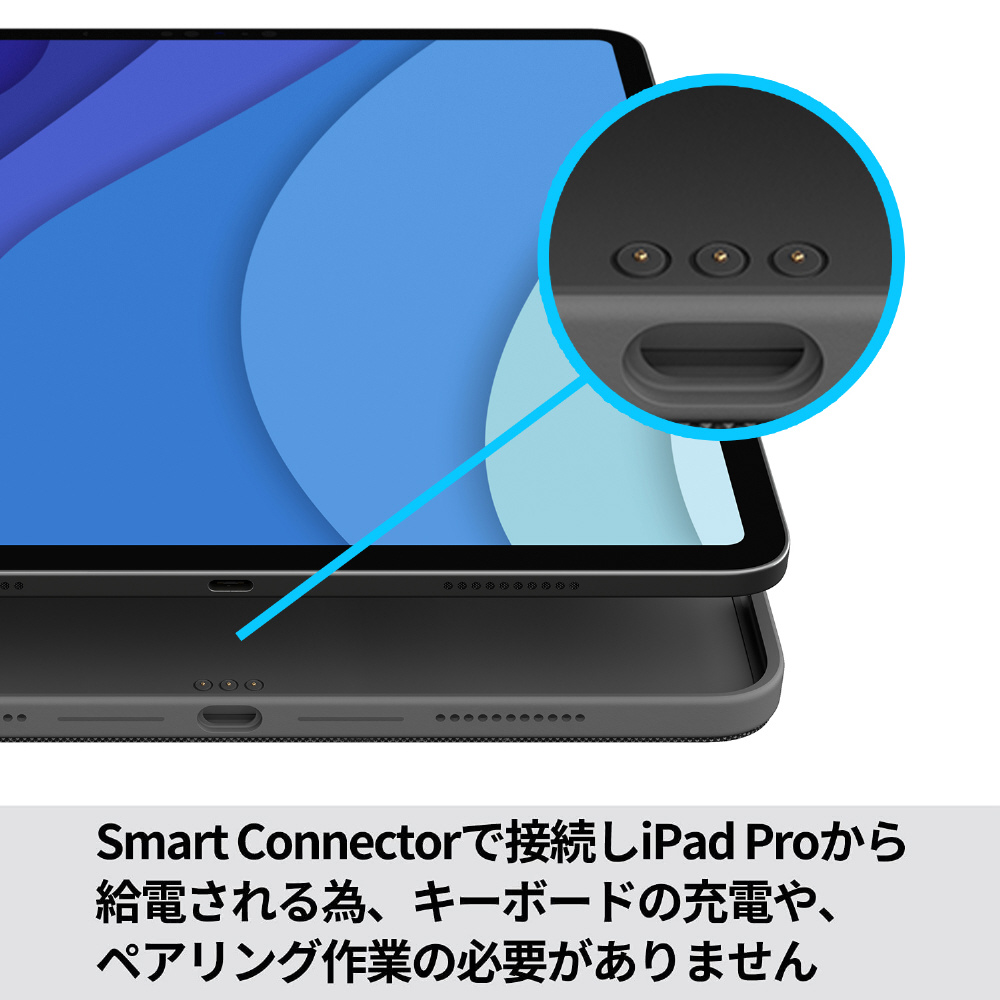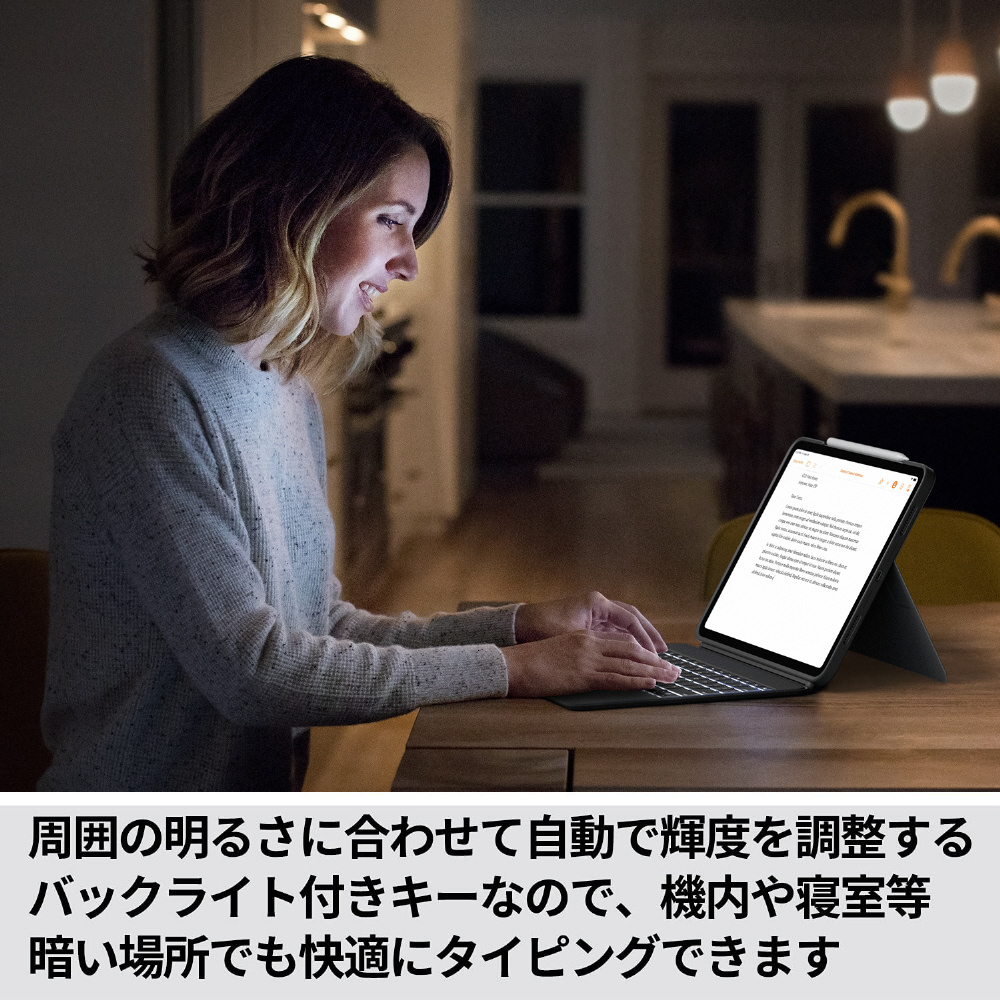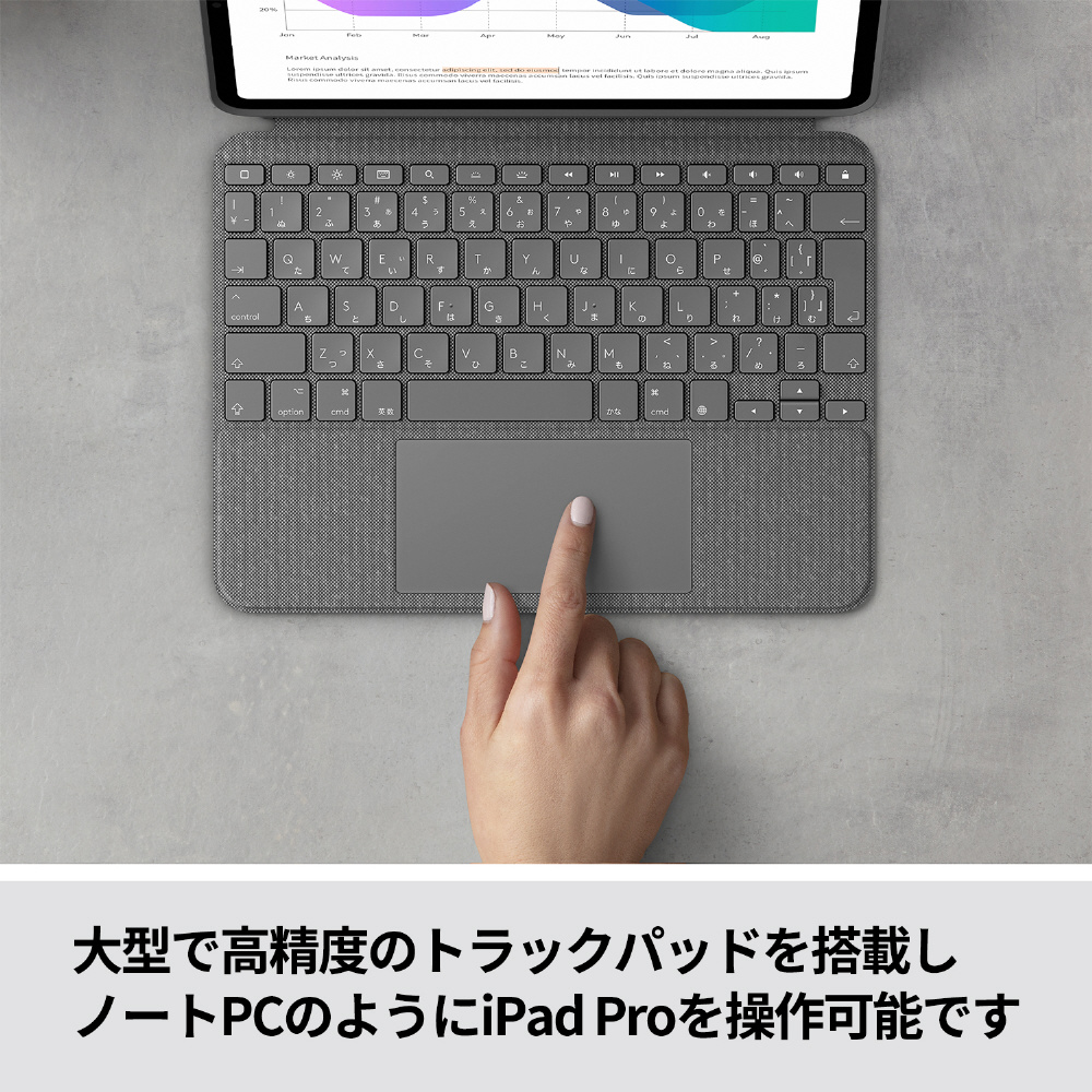 「COMBO TOUCH for iPad Pro」には精密なトラックパッドを搭載しており、iPadを保護しながらどこへでも持ち運んで、ノートPCのように効率良く作業できます。バックライトを搭載しているので暗い場所でもタイピングでき、キーボードを使わない時は取り外し可能です。iPad Pro 11インチ用と12.9インチ用両製品では日本語キーレイアウトと、従来よりも大きいトラックパッドを採用しています。
