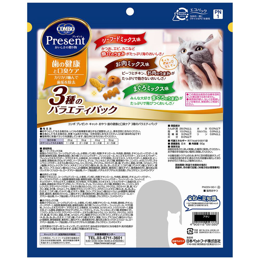 | 商品名 | コンボ プレゼント キャット おやつ 歯の健康と口臭ケア 3種のバラエティパック 90g |