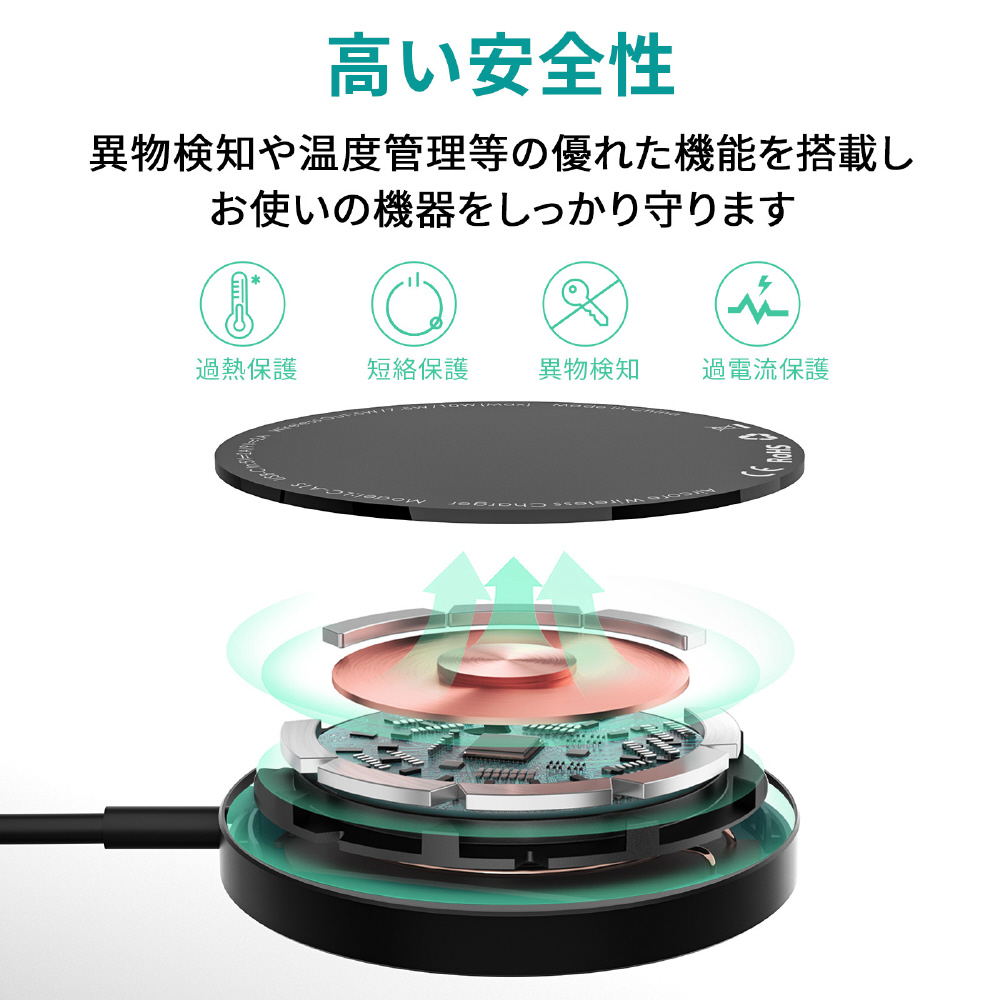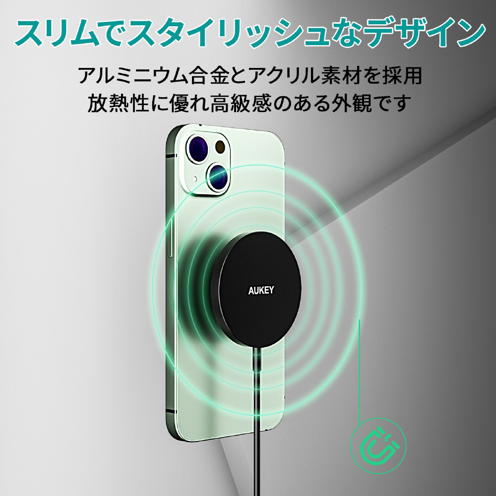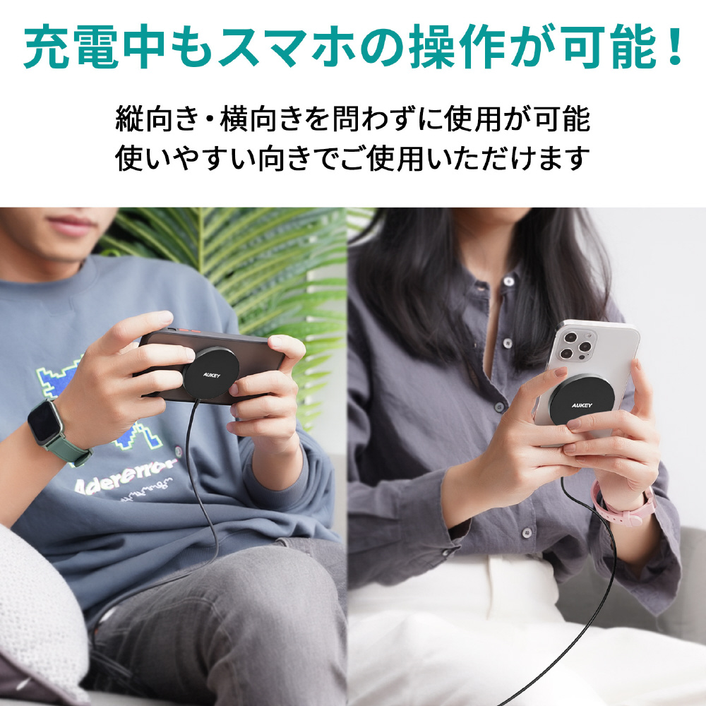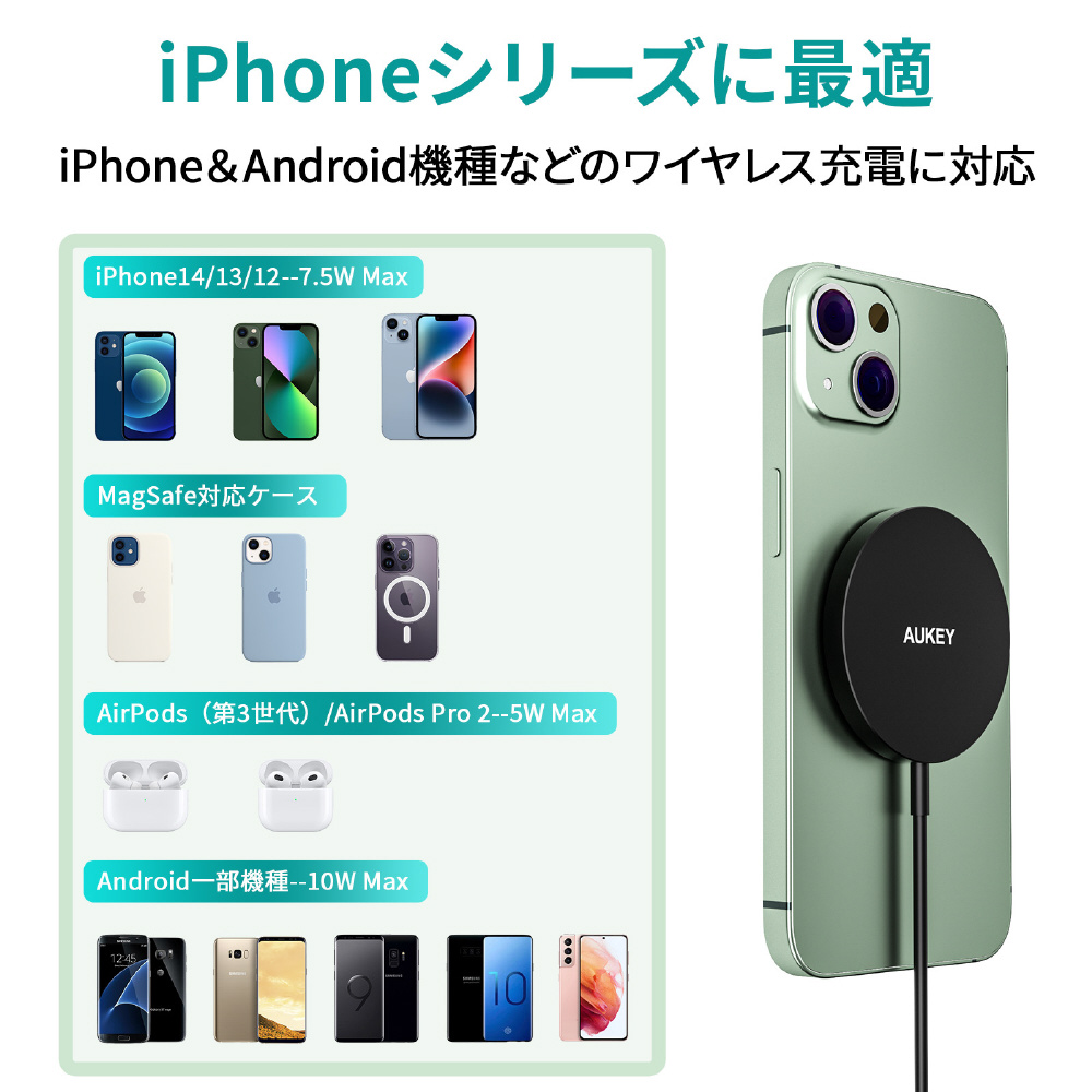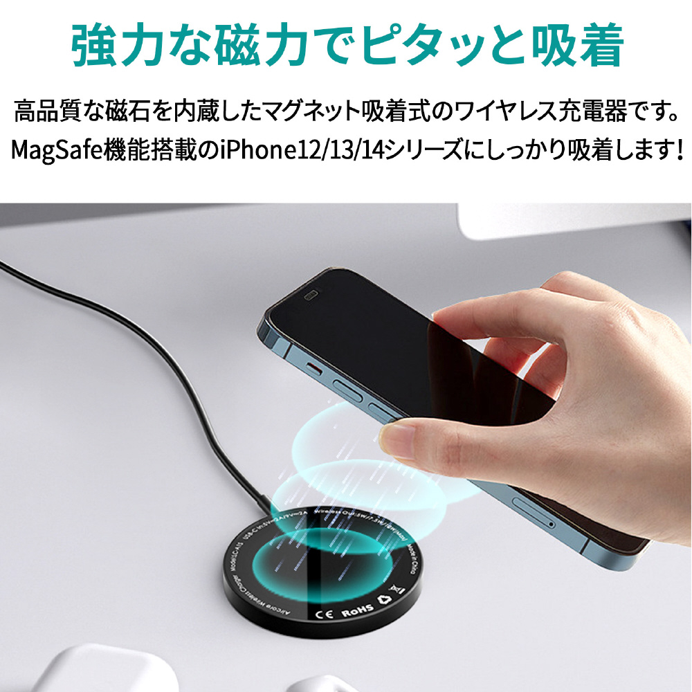 マグネット式ワイヤレス充電、MagSafe充電対応。iPhone14シリーズなどMagSafe充電対応のスマートフォンに磁石で吸着し、安全にワイヤレス充電ができます。