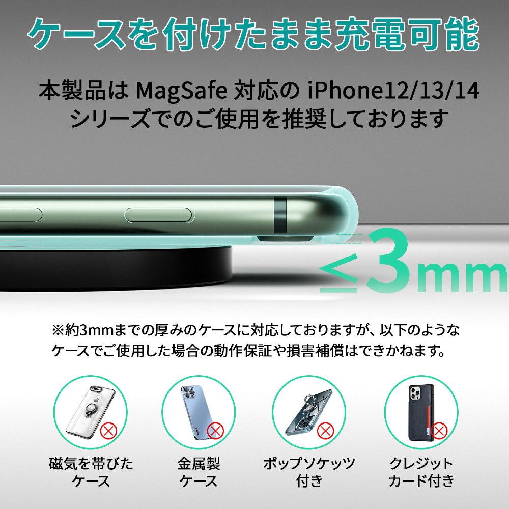内蔵されている磁石により、MagSafe搭載のiPhone12/13/14シリーズに強力な磁力でピタッと吸着するマグネット式ワイヤレス充電器です。