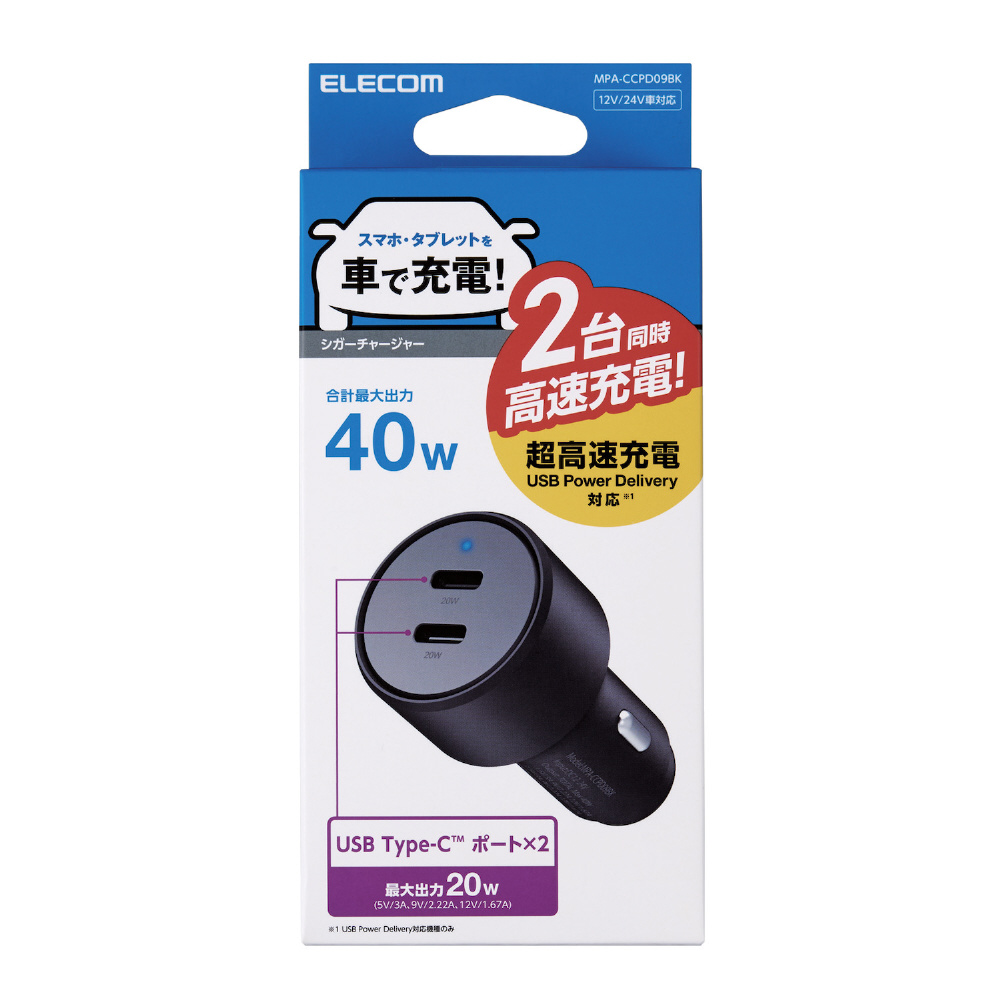 シガーソケット カーチャージャー 最大合計出力40W 2ポート USB C ×2 PD 20W 【 iPhone iPad Android など各種対応 】 車 充電器 ブラック MPA-CCPD09BK