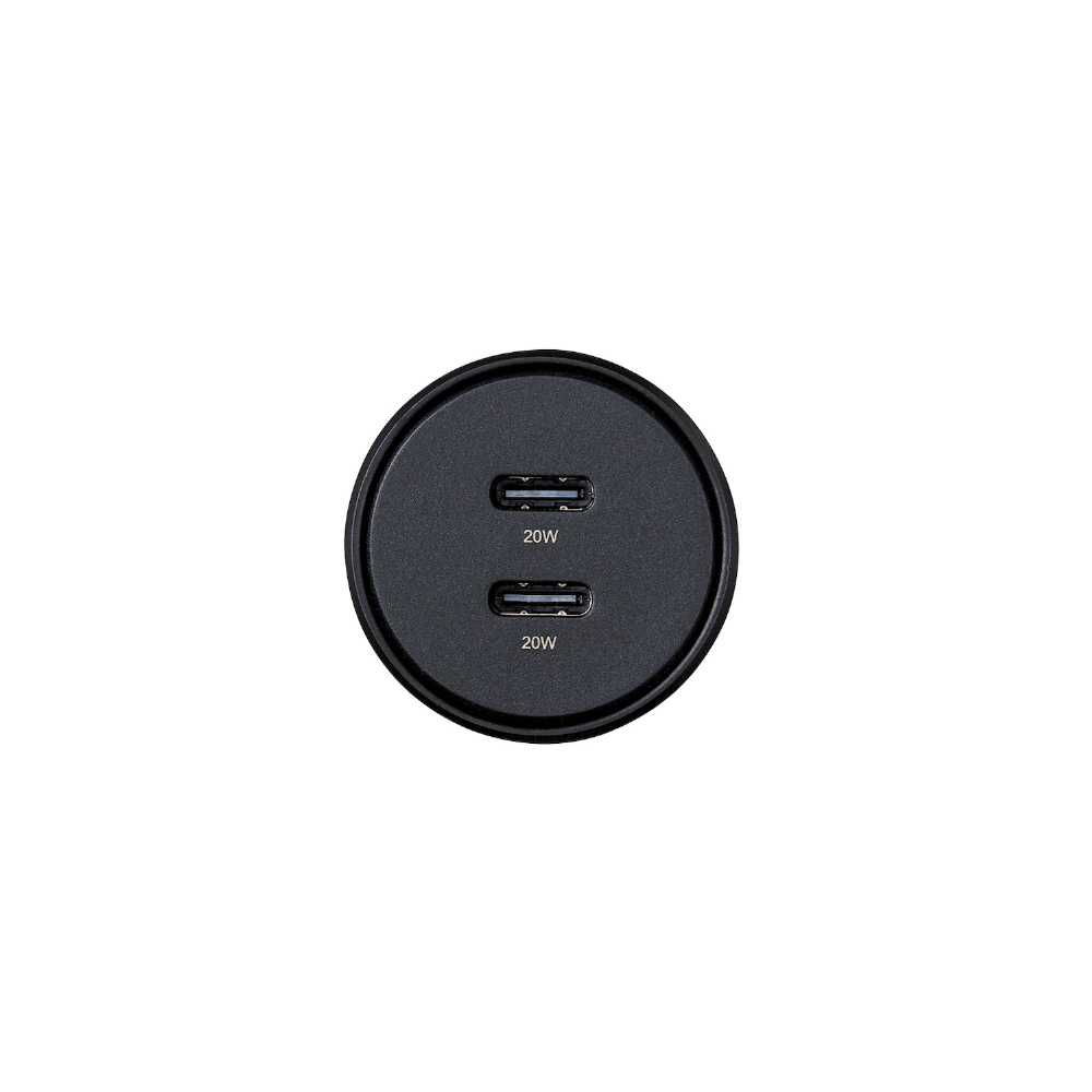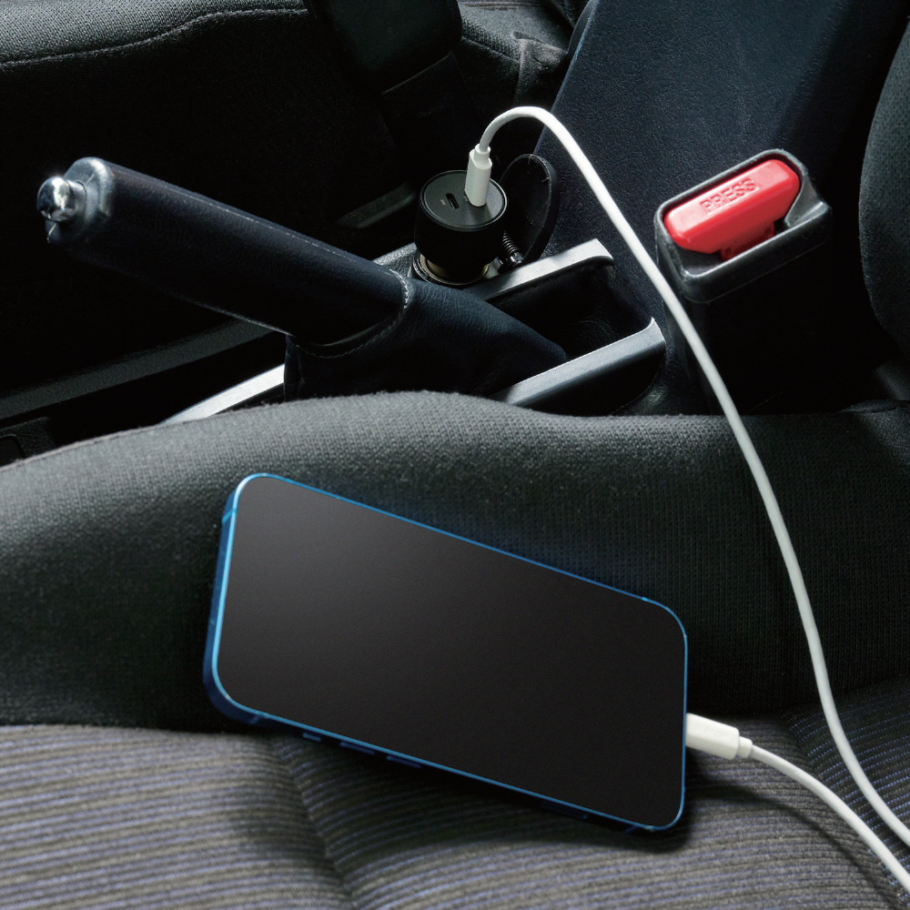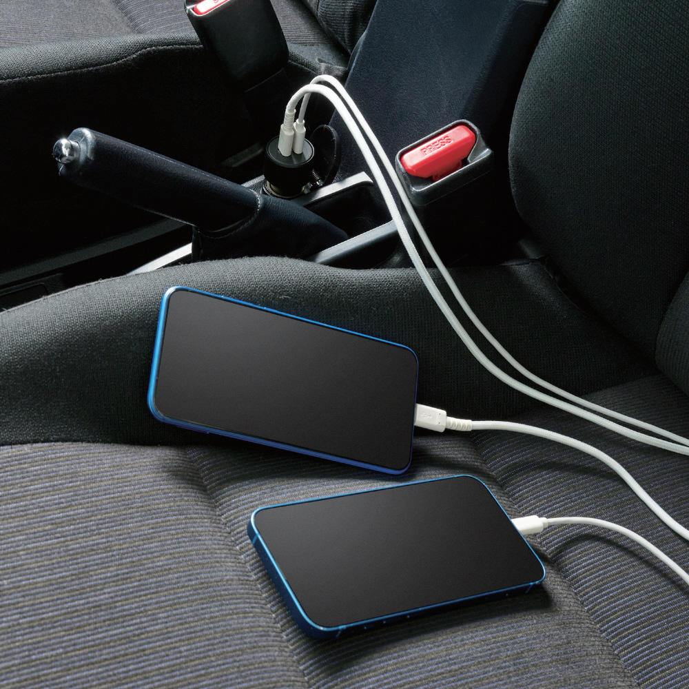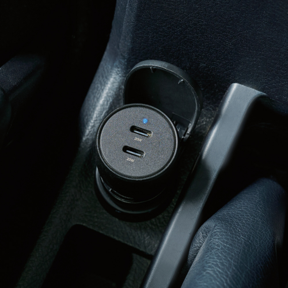 USB Power Delivery規格に準拠したUSB Type-C(TM)(USB-C(TM))ポートを2つ搭載し、スマートフォンなどの端末を2台同時に高速充電できる車載充電器です。合計最大40Wで高速充電が可能です。