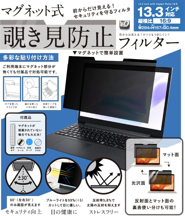 前からだけ見える!セキュリティを守るフィルタ マグネット式覗き見防止フィルター 13.3インチ対応