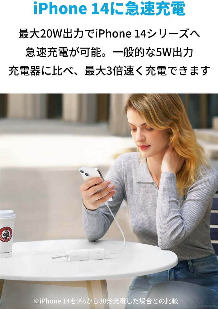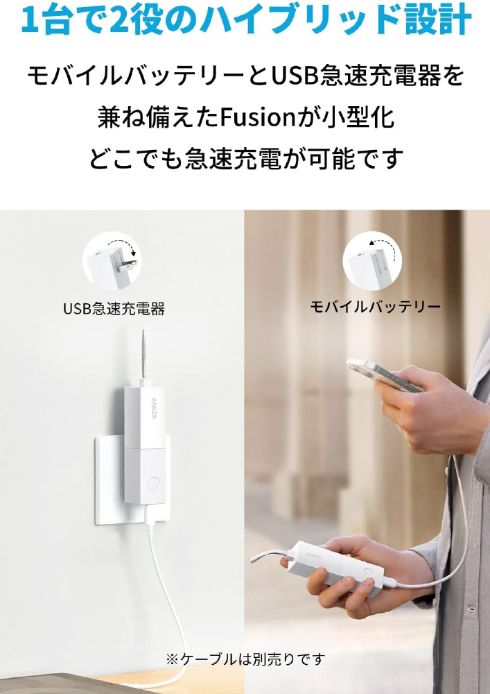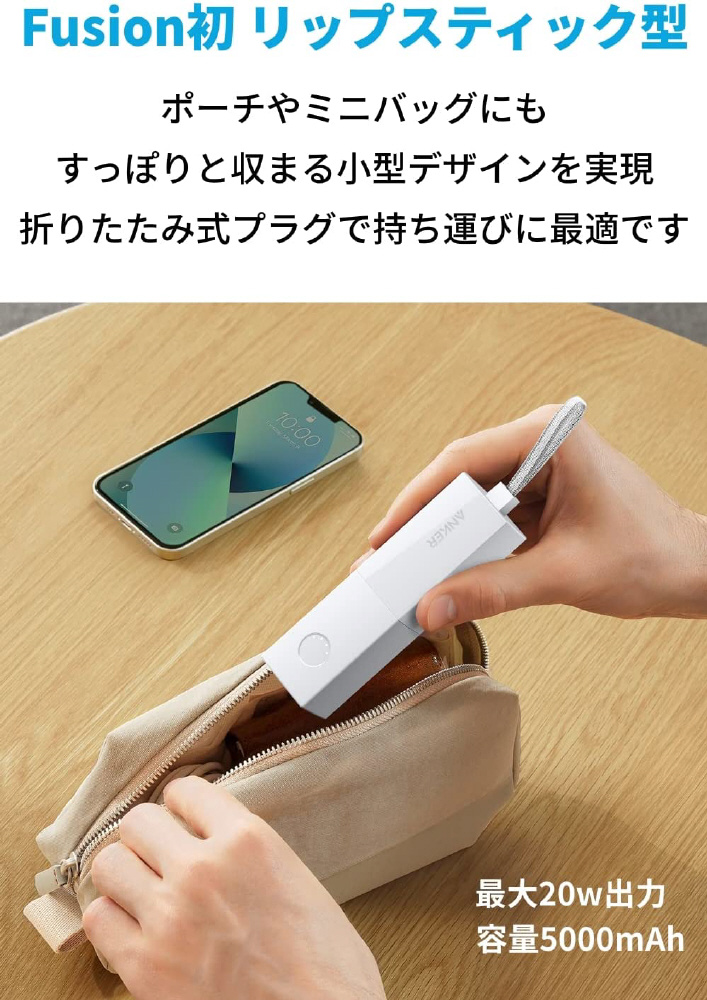 Fusionシリーズ初のリップスティック型 ポーチやミニバッグにもすっぽり入る小型デザイン。最大20W出力で、iPhone 13シリーズなどへ急速充電が可能です。