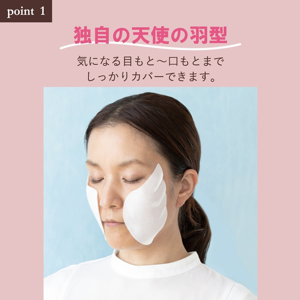 業界初の天使の羽型シートパックが、気になる目もとの小じわからほうれい線までしっかりカバーしてくれます。