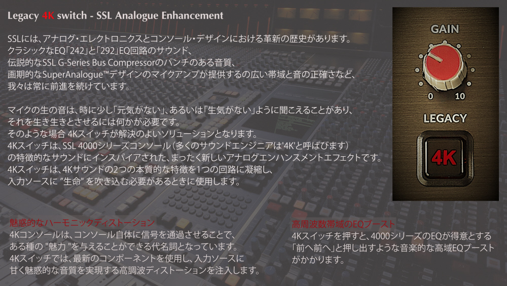 マイクの生の音は、時に少し「元気がない」、あるいは「生気がない」ように聞こえることがあり、それを生き生きとさせるには何かが必要です。そのような場合 Legacy 4Kスイッチが解決のよいソリューションとなります。Legacy 4Kは、SSL 4000シリーズコンソール(多くのサウンドエンジニアは4Kと呼びます)の特徴的なサウンドにインスパイアされた、まったく新しいアナログエンハンスメントエフェクトです。Legacy 4Kボタンは、4Kサウンドの2つの本質的な特徴を1つの回路に凝縮し、入力ソースに生命を吹き込む必要があるときに使用します。