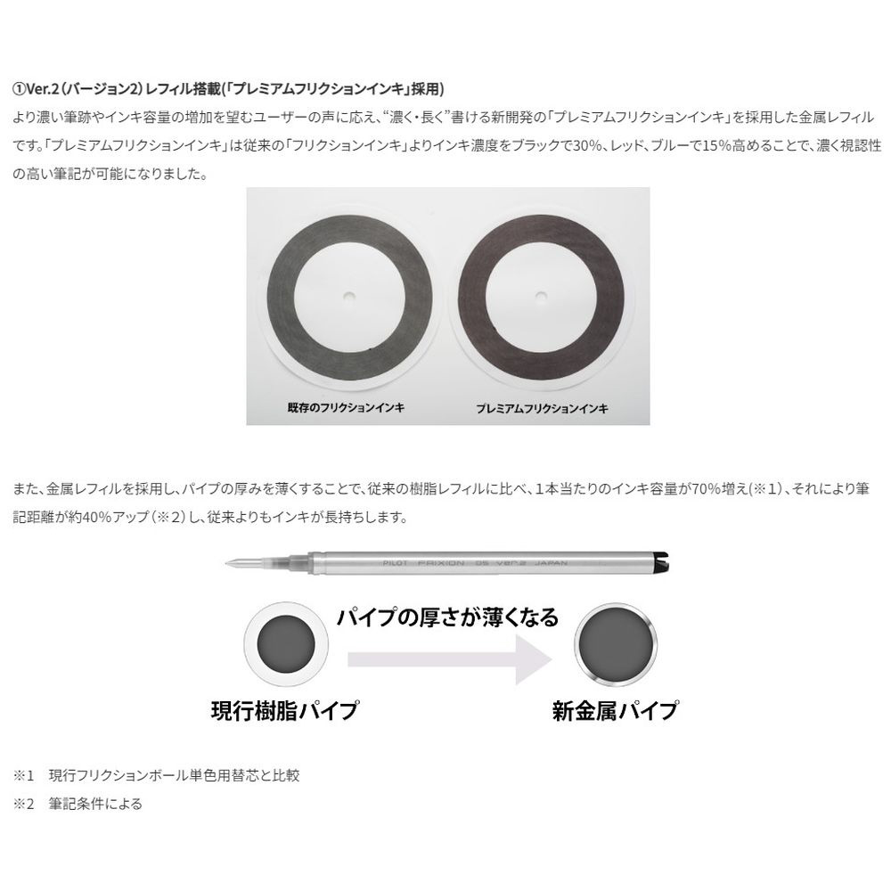 “濃く・長く”書ける新開発の「プレミアムフリクションインキ」を採用した金属レフィルです。