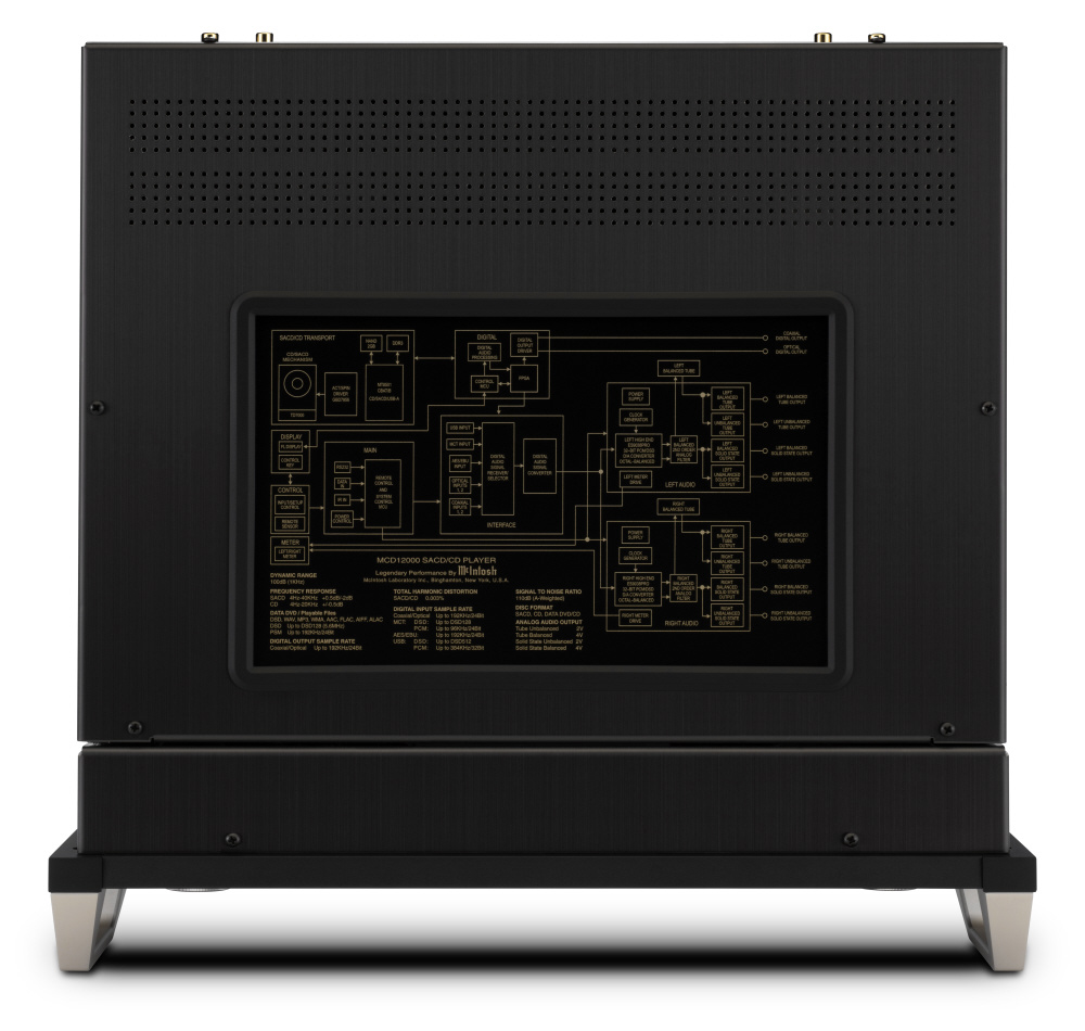 ・MCD12000は、マッキントッシュの伝統的なスタイリングに包まれています。筐体下部は鏡面仕上げのステンレススチール、上部は同じヘアライン仕上げのブラックチタニウムステンレススチールとなっており、ホームオーディオシステムに豊かさと洗練さをもたらしてくれます。正面には、ブラックガラスパネル、イルミネーションロゴ、ノブ、プッシュボタン、アルミ削り出しハンドルなど、伝統のマッキントッシュ製品と統一感のあるデザインを採用しています。上面には、性能仕様とオーディオ信号経路のブロックダイアグラムがガラスパネルに浮かび上がっています。