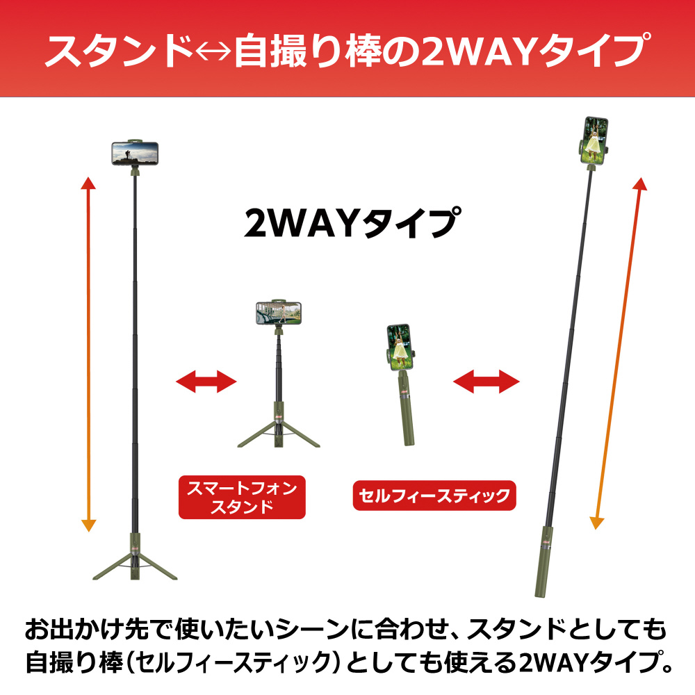 お出かけ先で使いたいシーンに合わせ、スタンドとしても自撮り棒(セルフィースティック)としても使える便利な2WAYタイプの自撮りスタンド。
