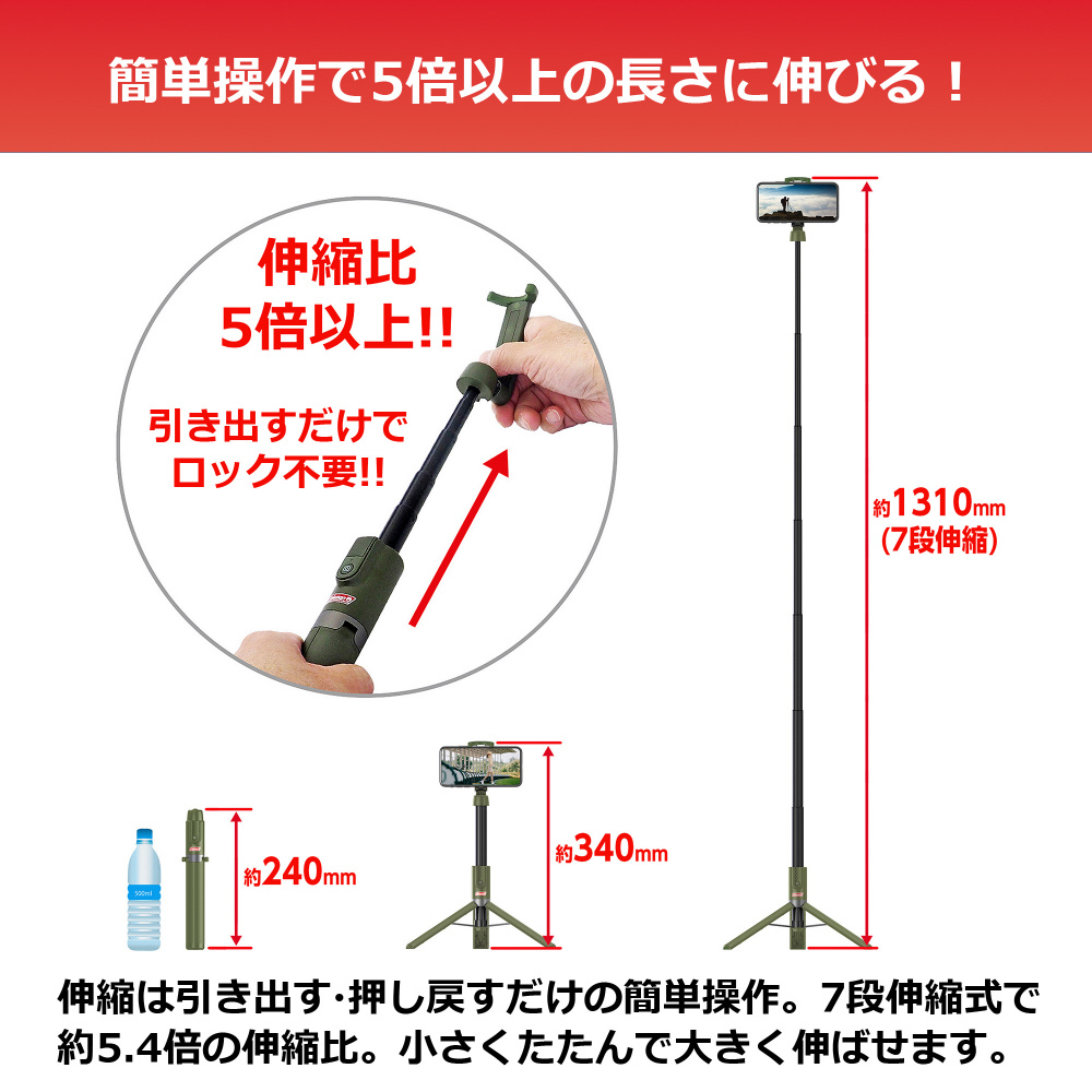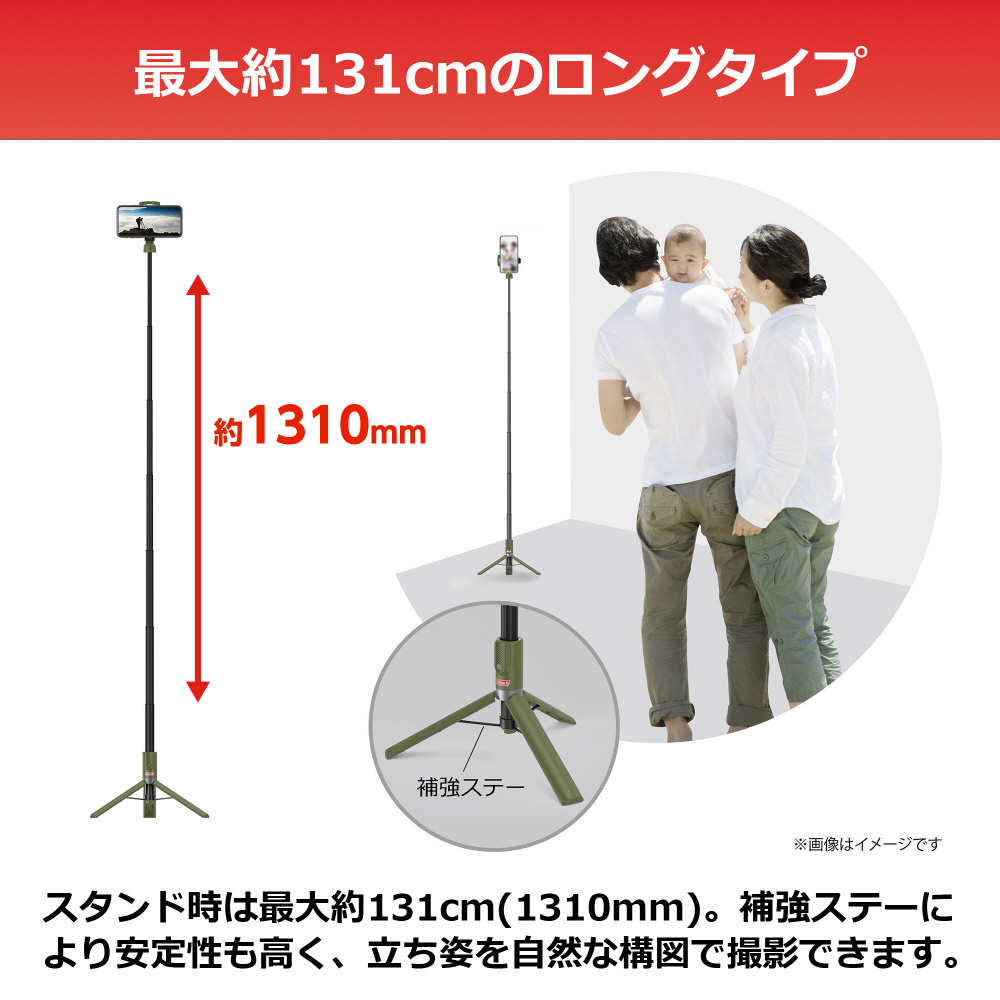 7段伸縮で最大約131cm。スタンドと自撮り棒の2ウェイで様々な撮影シーンに対応。