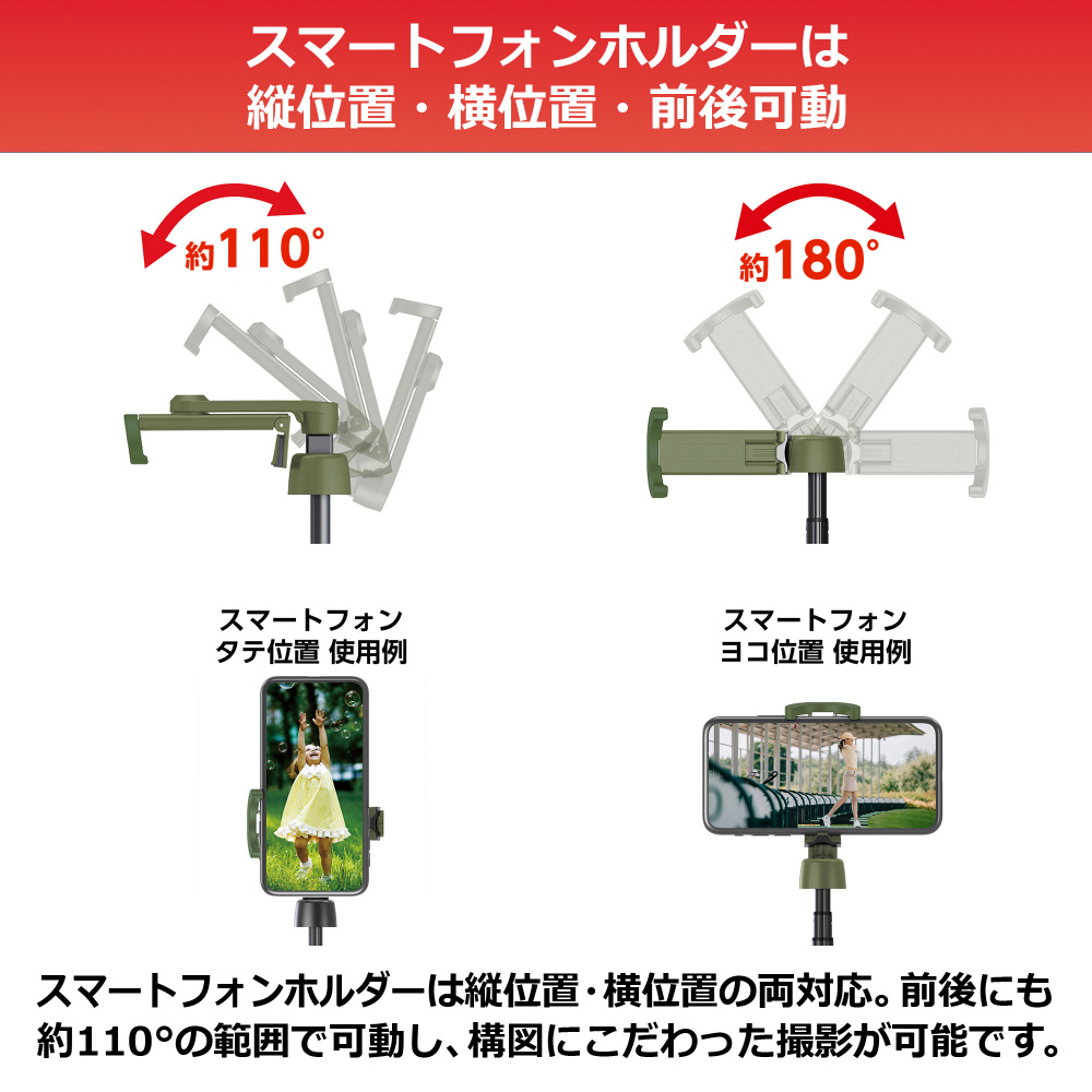 スマートフォンホルダーは縦位置・横位置の両方に対応。さらに前後にも約110°の範囲で動かすことができ、構図にこだわった撮影が可能です。