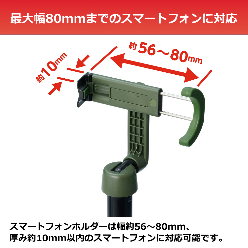 スマートフォンホルダーは幅約56〜80mm、厚み約10mm以内のスマートフォンに対応可能です。