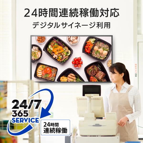 24時間連続稼働に対応しているので、長時間稼働が必要となる、商業施設や小売店舗、宿泊施設などでのデジタルサイネージで安心してご利用いただけます。