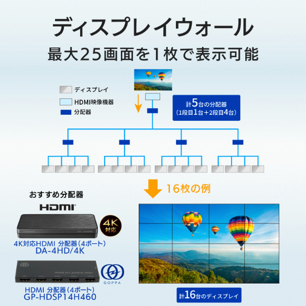 HDMI分配器と組み合わせて使用することにより、最大25画面で1枚の画像表示を実現します。