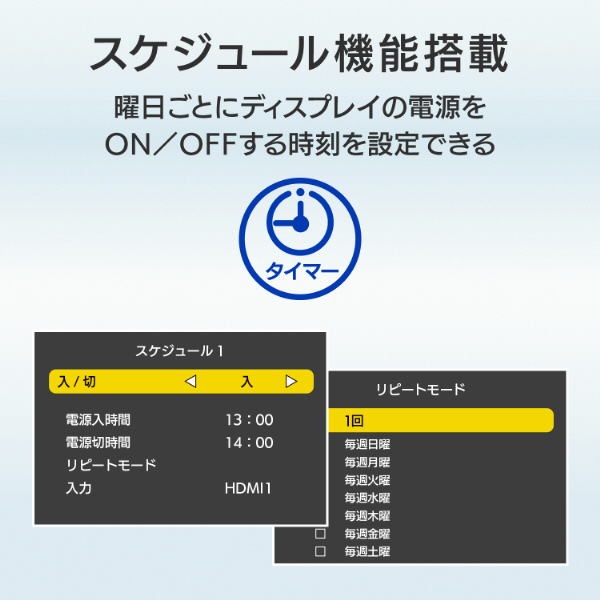 曜日ごとにディスプレイの電源をON/OFFする時刻を設定できます。