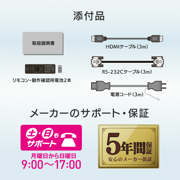 | 付属品 | 電源コード(3m、PSE適合品)、HDMIケーブル(3m)、RS232Cケーブル(3m)、リモコン、単4電池(動作確認用、2 本)、取扱説明書 |