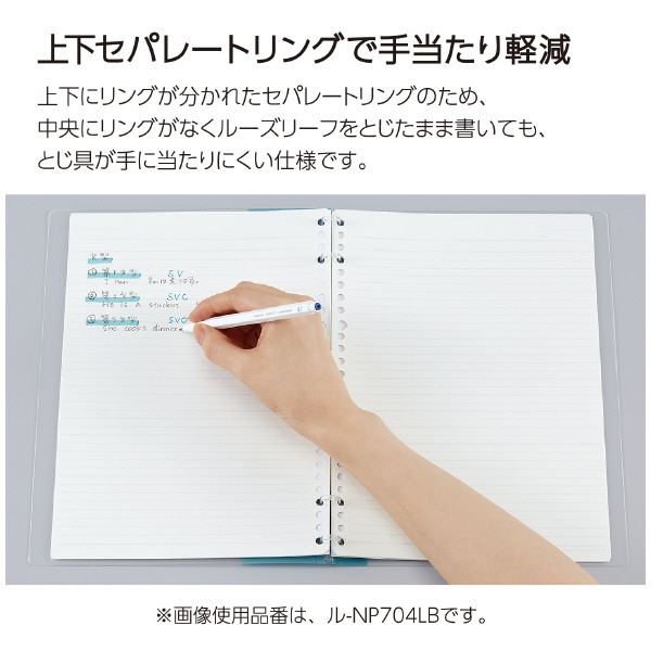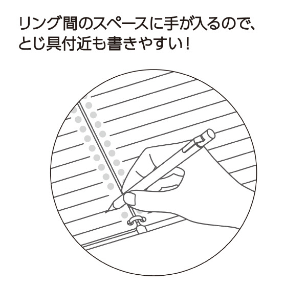 ●ルーズリーフを綴じたまま書いても綴じ具が手に当たりにくい2X2リング。