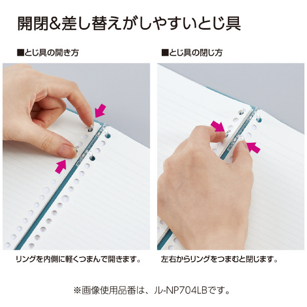 ●綴じ具が広く開いて中紙の差し替えもスムーズです。