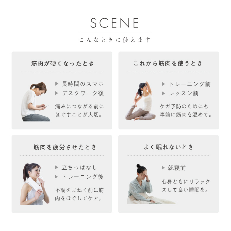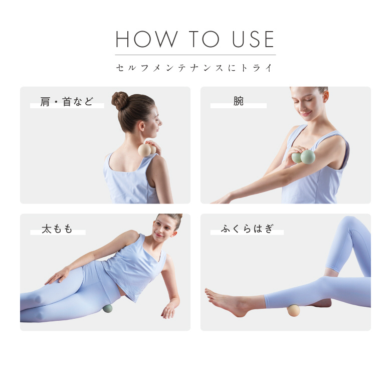 体重を預けてこりをピンポイントで押しほぐしたり、気になる部位に当てて転がし血行をよくするなど、多様な使い方ができます。