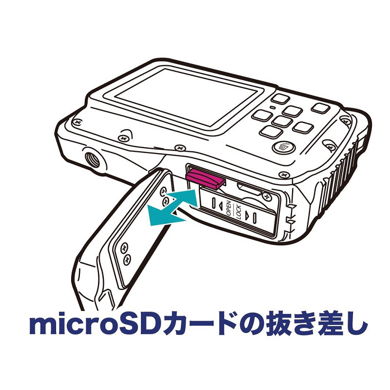 動画も撮れる。セルフタイマー機能付き。microSDカード32GBまで対応