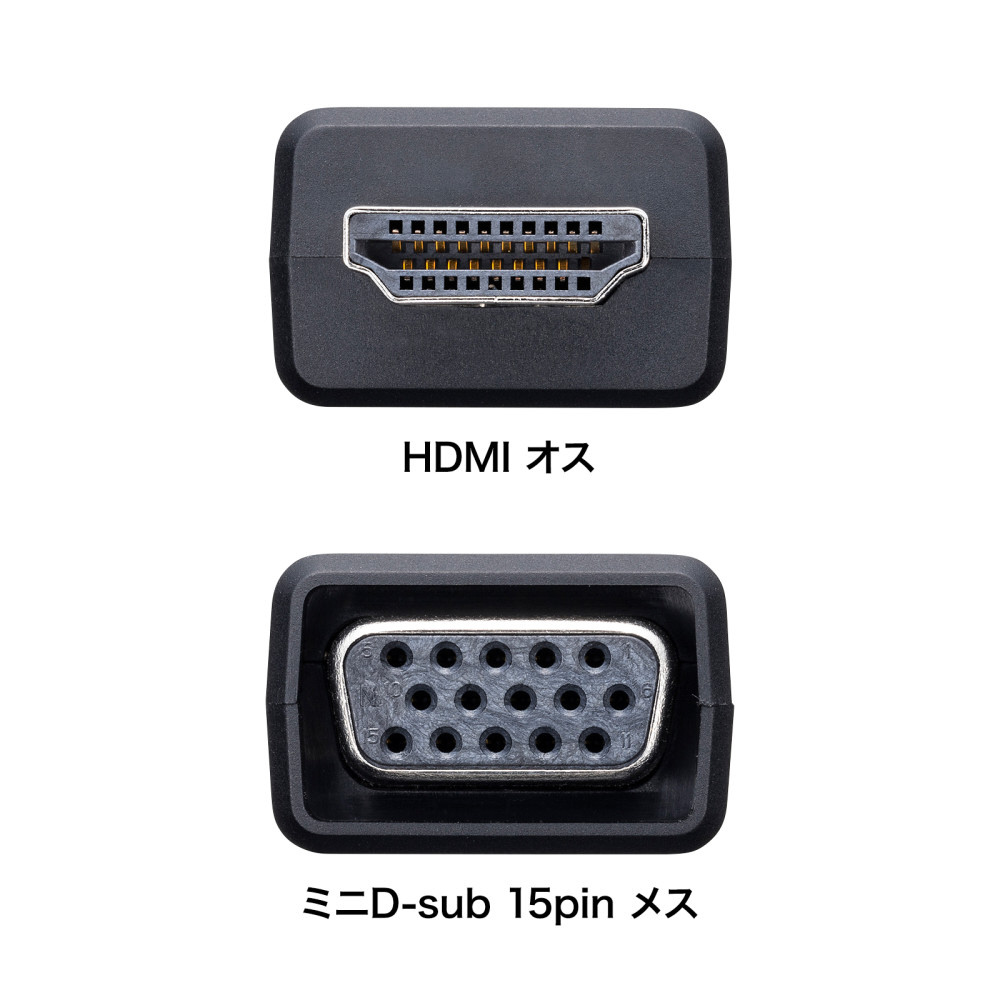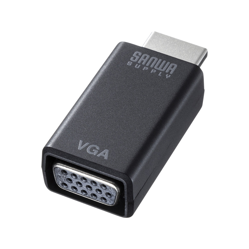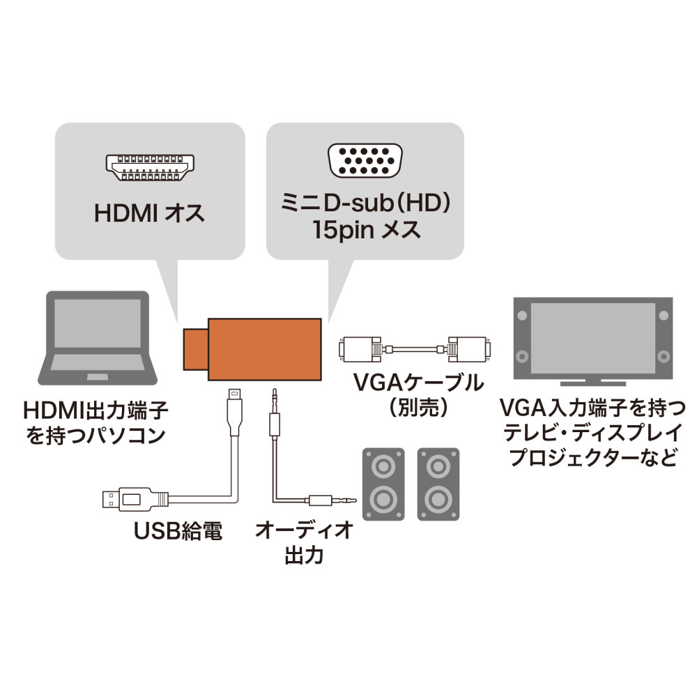 HDMIコネクタからのデジタル映像+オーディオ出力をVGAコネクタ(ミニD-sub(HD)15pin)とアナログオーディオに変換できる。