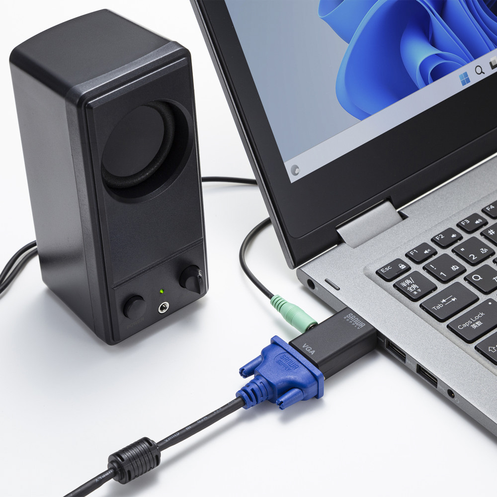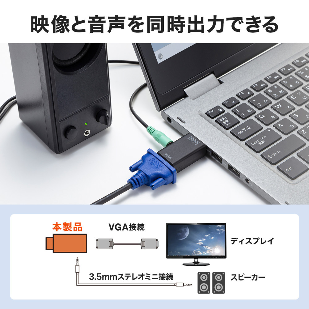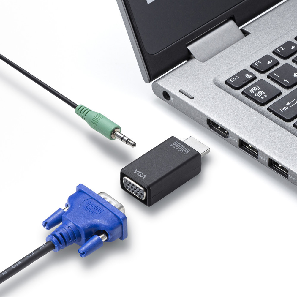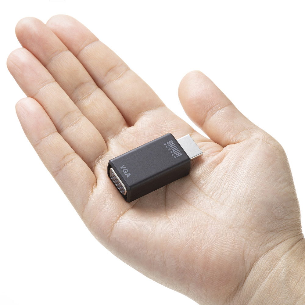 HDMIコネクタからのデジタル映像+オーディオ出力をVGAコネクタ(ミニD-sub(HD)15pin)とアナログオーディオに変換できる。