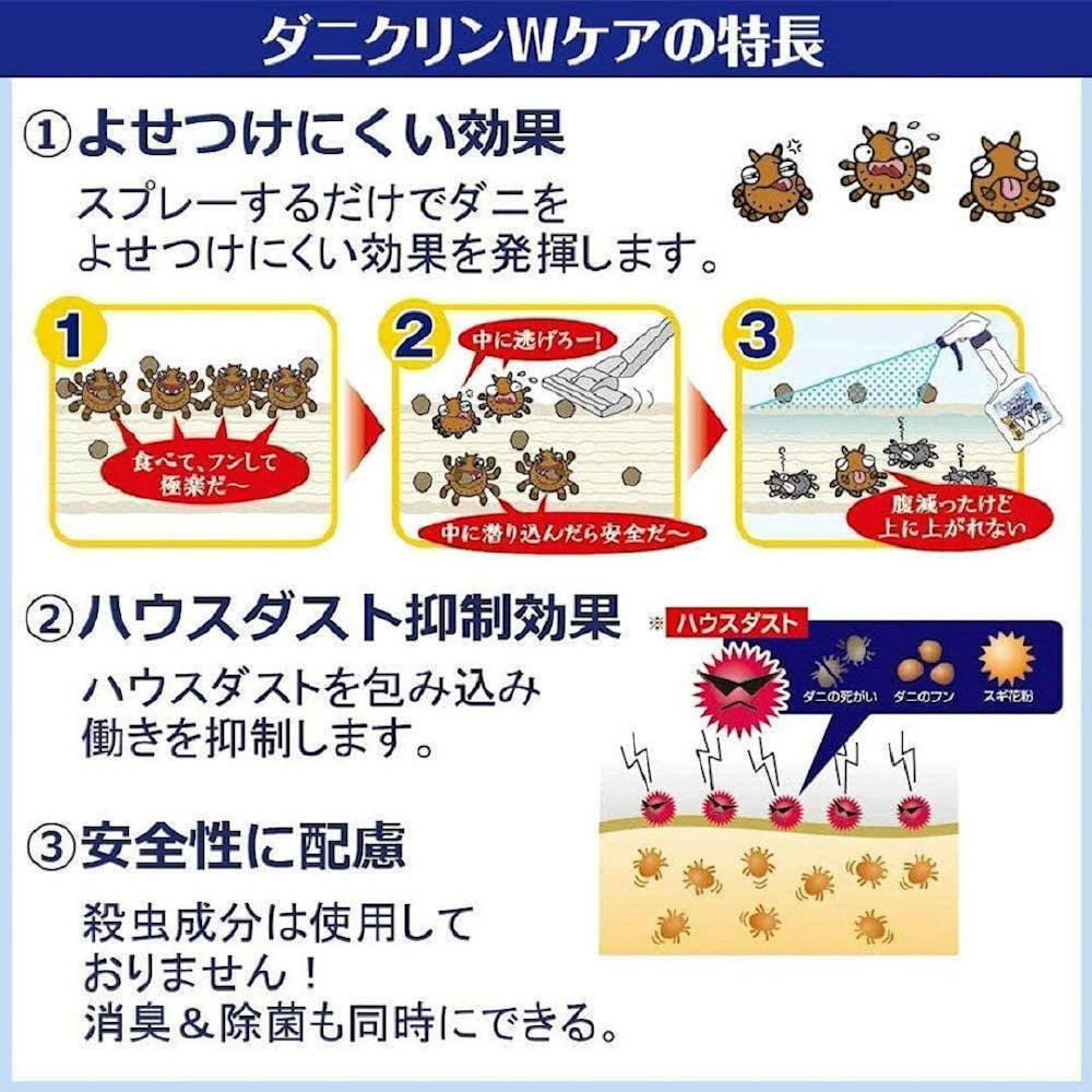ダニを寄せつけにくくする効果に消臭除菌効果をプラス。さらにハウスダストの働きを抑制します。殺虫剤成分不使用なのでお子様にも安心です。