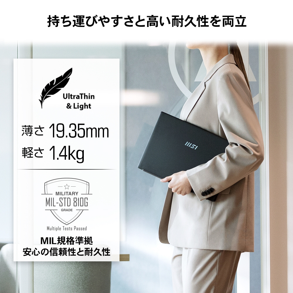Modern 14 C11シリーズは、薄さ19.35mm・軽さ1.4kgでビジネスバッグやバックパックに収納して気軽に持ち運ぶことができます。ビジネス用途やキャンパスライフなど持ち運ぶ機会の多い利用シーンにピッタリの薄型・軽量デザインになっています。