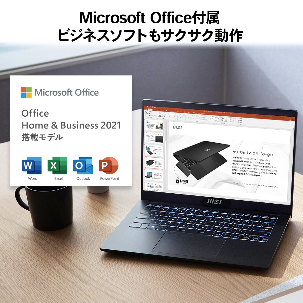 資料作成やプレゼンテーションなどに便利な「Microsoft Office Home & Business 2021」が付属。オフィスソフトを別途お求めいただかなくてもすぐに使い始めることが可能。
