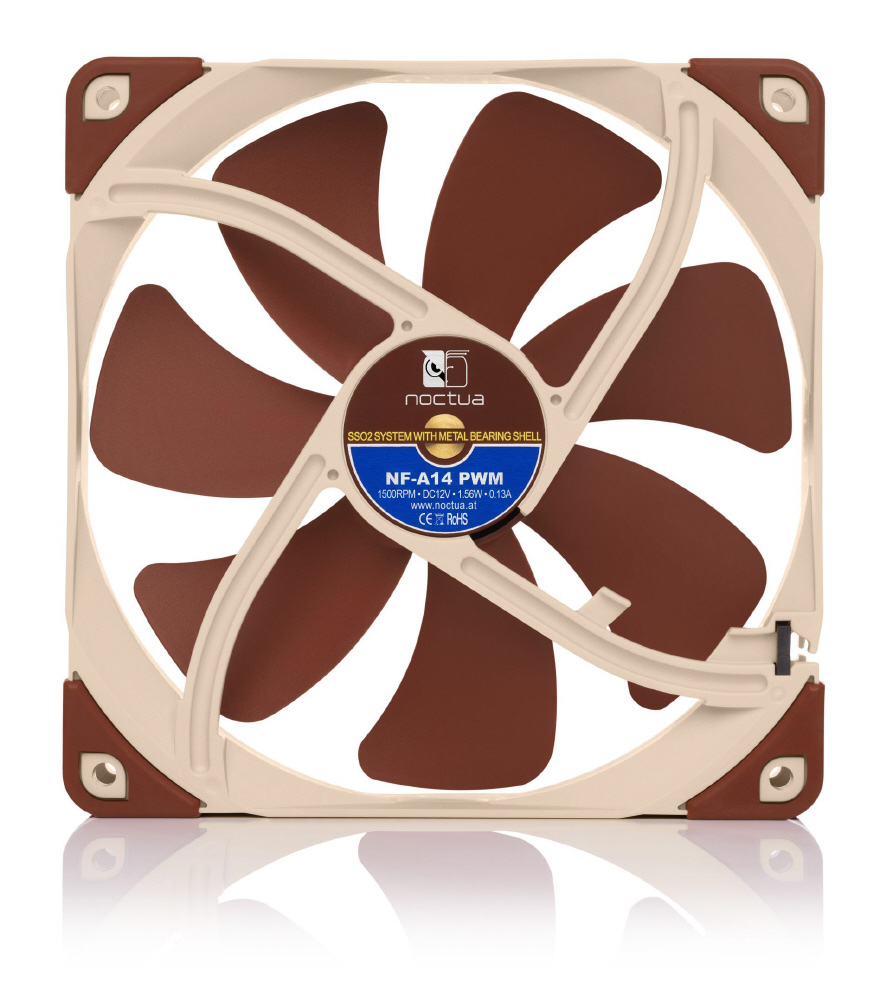 NF-A14は、NoctuaのAAO (Advanced Acoustic Optimisation) 規格に準拠した正方形のフレームを備えたプレミアム品質の静音140mmファンです。