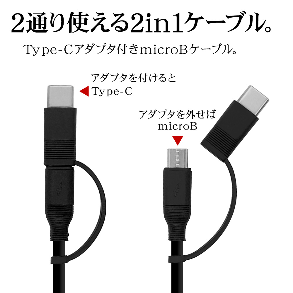 本製品は、Type-C変換アダプタ付きUSBケーブルとUSB Type-Aポートを2個搭載した最大出力 5V/2.4AのAC充電器のセット製品です。