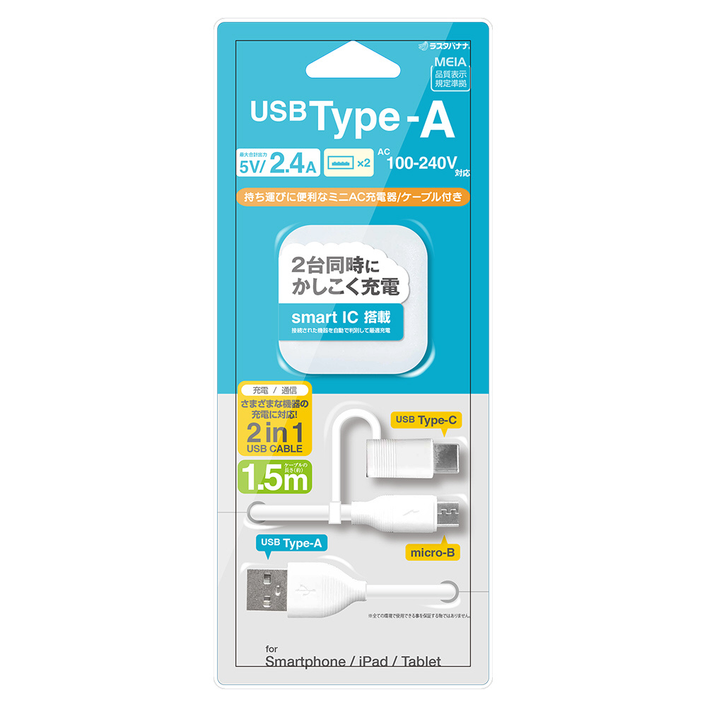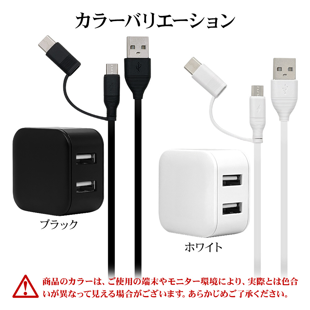 | 商品名 | AC充電器 USB A*2ポート 2.4A(A to microBケーブル1.5m+TypeC変換) |