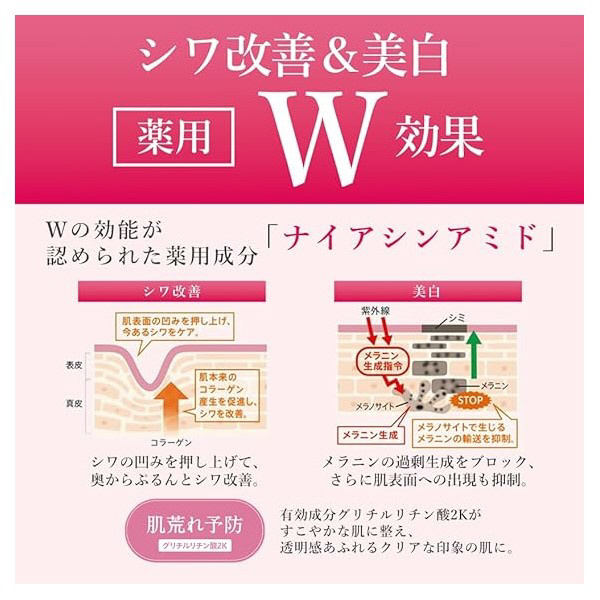 シワ改善成分「ナイアシンアミド」&肌荒れを防止する「グリチルリチン酸2K」のW有効成分。