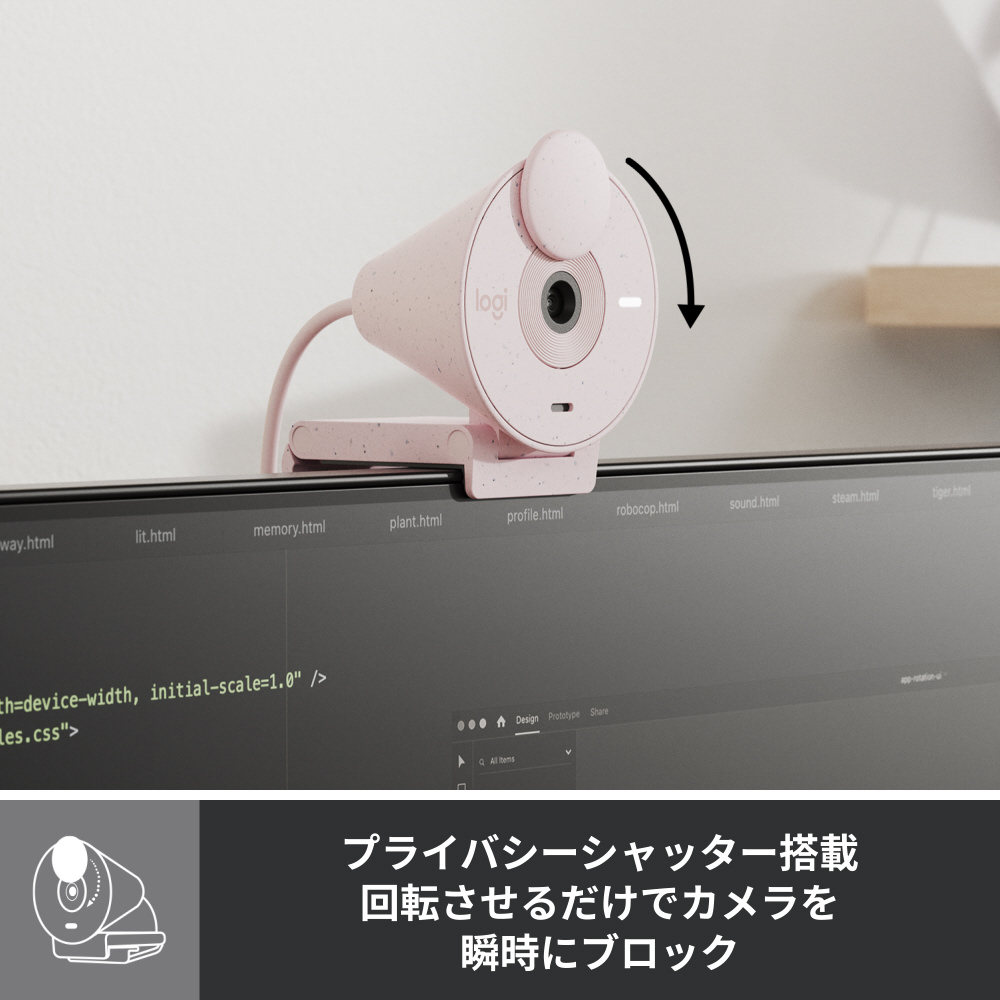再生プラスチックを使用し、サンドストーン風テクスチャをデザイン要素として取り入れた本体は、流麗で美しい外観となっています。またグラファイト、オフホワイト、ローズの3色を展開することで、ユーザーのテイストに合わせたデスク周りのデコレーションや、スタイリッシュなワーキングスペースの演出が可能になります。性能面については、ロジクール独自の自動光補正機能RightLight とノイズリダクション機能付きのモノラルマイクを採用し、常に最適な状態でミーティングに臨めるようユーザーをサポートします。またプライバシーを保護する一体型レンズカバーを搭載し、カバー部分を簡単に回すことで瞬時に撮影を瞬時にブロックすることができます。Microsoft Teams、 Google Meet及びZoom認証製品で、ミーティングプラットフォームをほぼ網羅した優れた互換性を持ち、どのプラットフォームにおいても快適なオンライン会議体験を提供します。