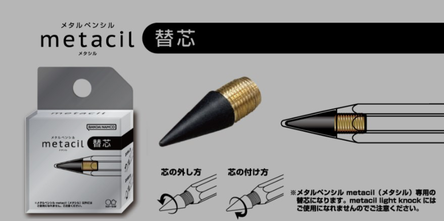 ※【注】メタルペンシル metacil(メタシル)専用の替芯になります。metacil light knock(メタシルライトノック)にはご使用になれませんのでご注意下さい。