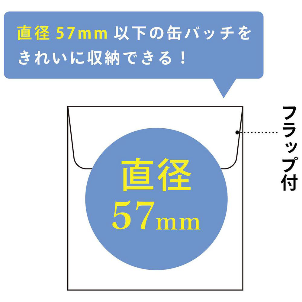 トップインタイプ。片面ポケット。フラップ付き。缶バッジ(〜直径57mm)やキーホルダーが入る。