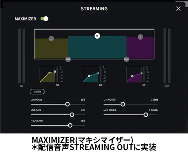 配信音声(STREAMING OUT)に「MAXIMIZER(マキシマイザー)」機能を搭載し、音量の変化を抑えながら音圧を稼ぎ、配信先のリスナーへ聴きやすく心地よいオーディオ体験を提供することが可能です。
