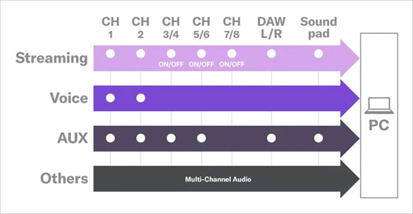 AG08からPCへ送られる入力デバイスは、目的別の名称をもつ3系統とASIOチャンネルです。