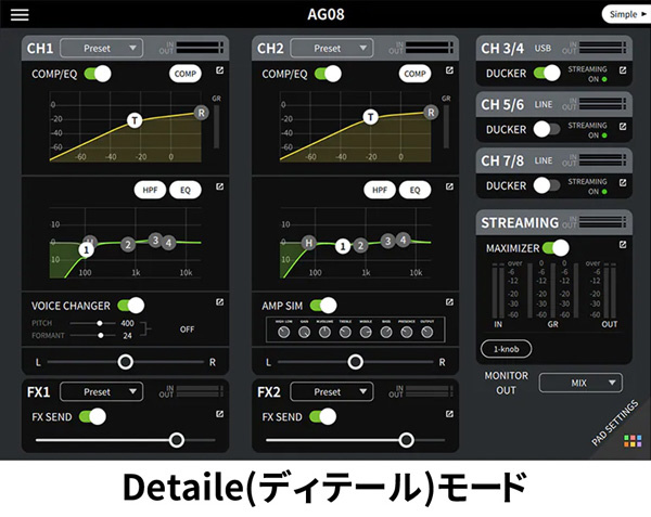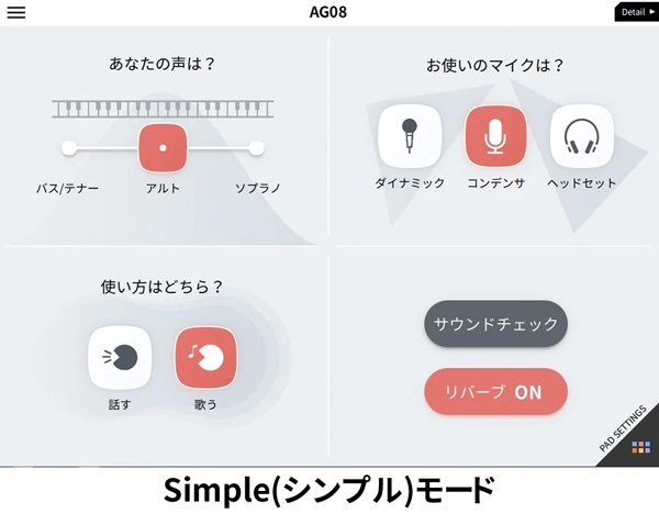 Windows/Mac版、iPhone版のAG08シリーズ専用エディターアプリでは、本体設定や各パラメーターの詳細変更や保存が可能です。設定を細かく調整可能な「Detail(ディテール)モード」のほか、導入して最初にマイクから音を出すまでの操作を解説する「Simple(シンプル)モード」を搭載。チュートリアル内でマイク音の録音/確認も行えるため、初めての接続も実際に確認しながらサポートいたします。