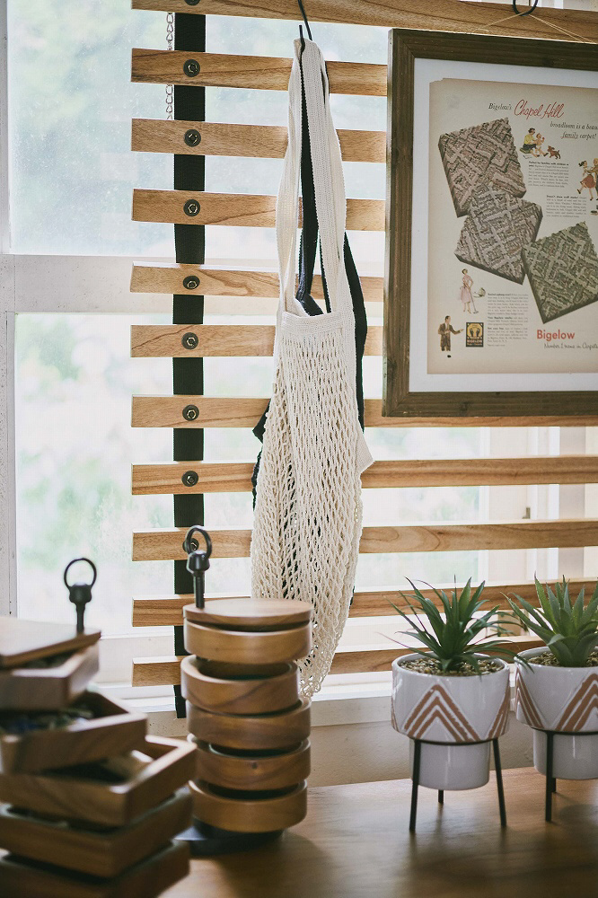 ■一つ一つ風合いが異なる個性的な天然木(ミンディ)を使用した、リゾートテイストのロールパーテーション。