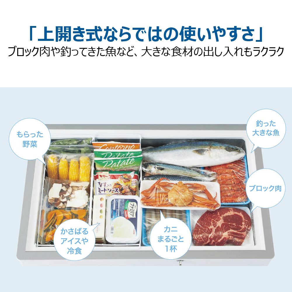 ・ブロック肉や釣ってきた魚など、大きな食材の出し入れもラクに行える上開き式冷凍庫。冷たい空気は下方に流れるので、冷気が逃げにくいこともメリット。食材をしっかり冷凍保存します。
