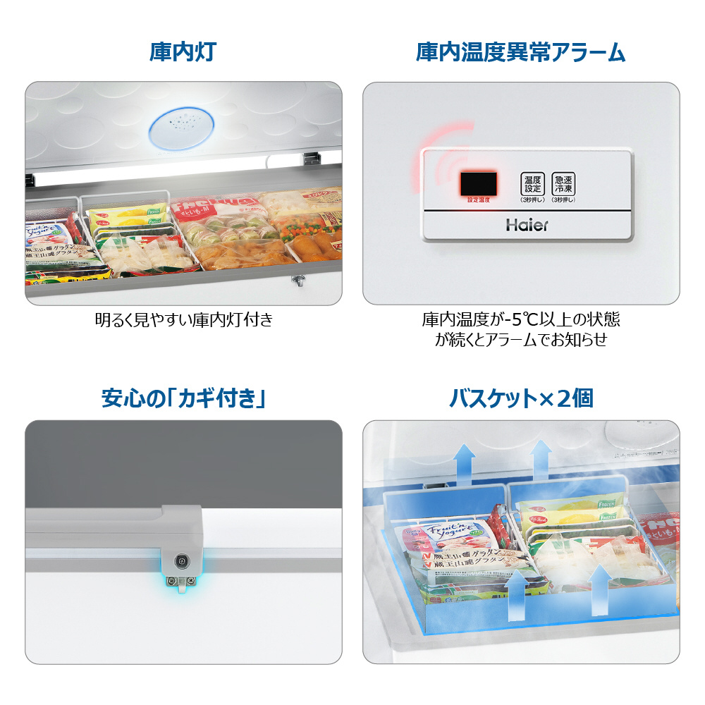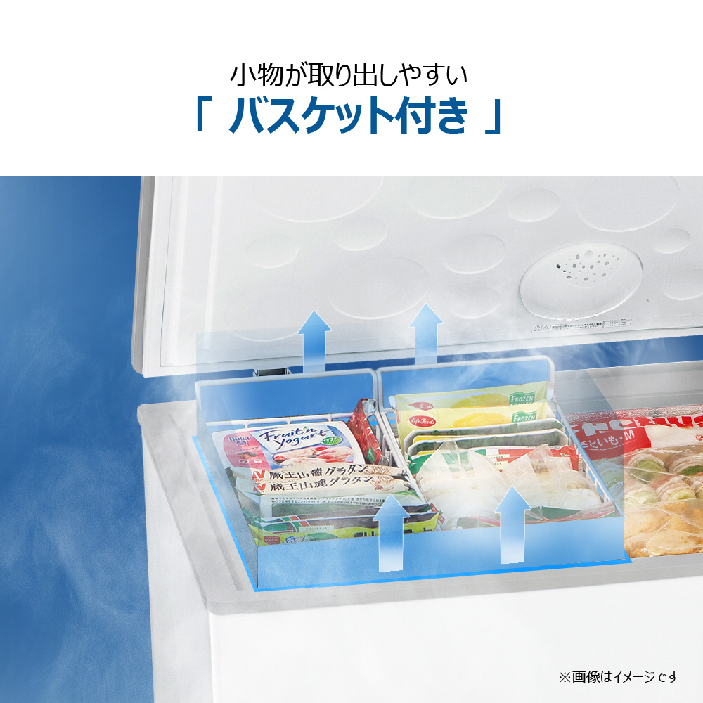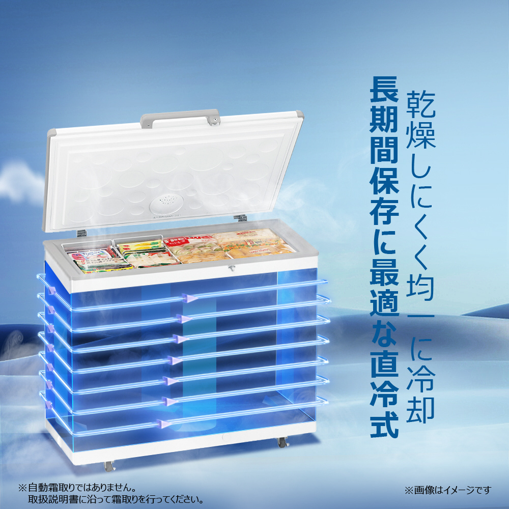 ・冷気が逃げにくく、長期間保存向き。霜取り必要。 ※自動霜取りではありませんので取扱説明書に沿って霜取りを行って下さい。