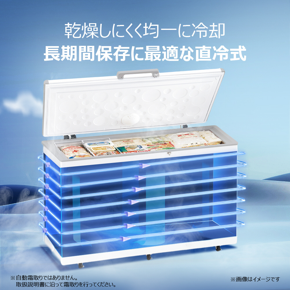 ・冷気が逃げにくく、長期間保存向き。霜取り必要。 ※自動霜取りではありませんので取扱説明書に沿って霜取りを行って下さい。