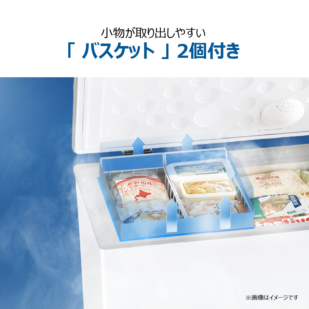 ・ブロック肉や釣ってきた魚など、大きな食材の出し入れもラクに行える上開き式冷凍庫。冷たい空気は下方に流れるので、冷気が逃げにくいこともメリット。食材をしっかり冷凍保存します。