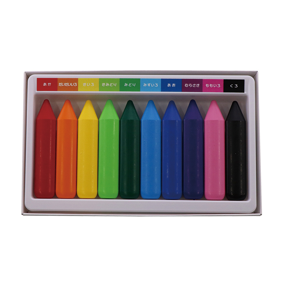 ベタつきや塗りカスが少ないので、汚れを気にせず安心して使えます。持ちやすい三角太軸です。はじめてのおえかきに適した10色セットです。安全性に配慮した原材料を使用しています。