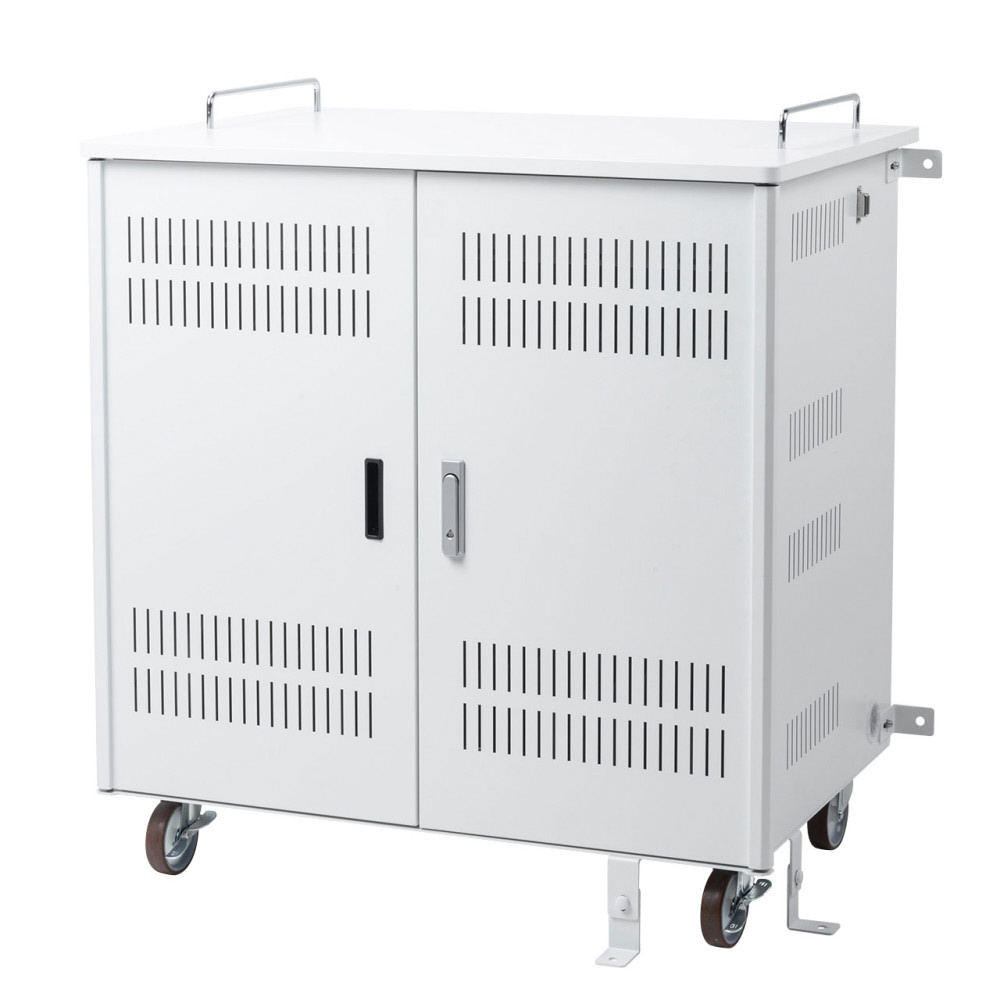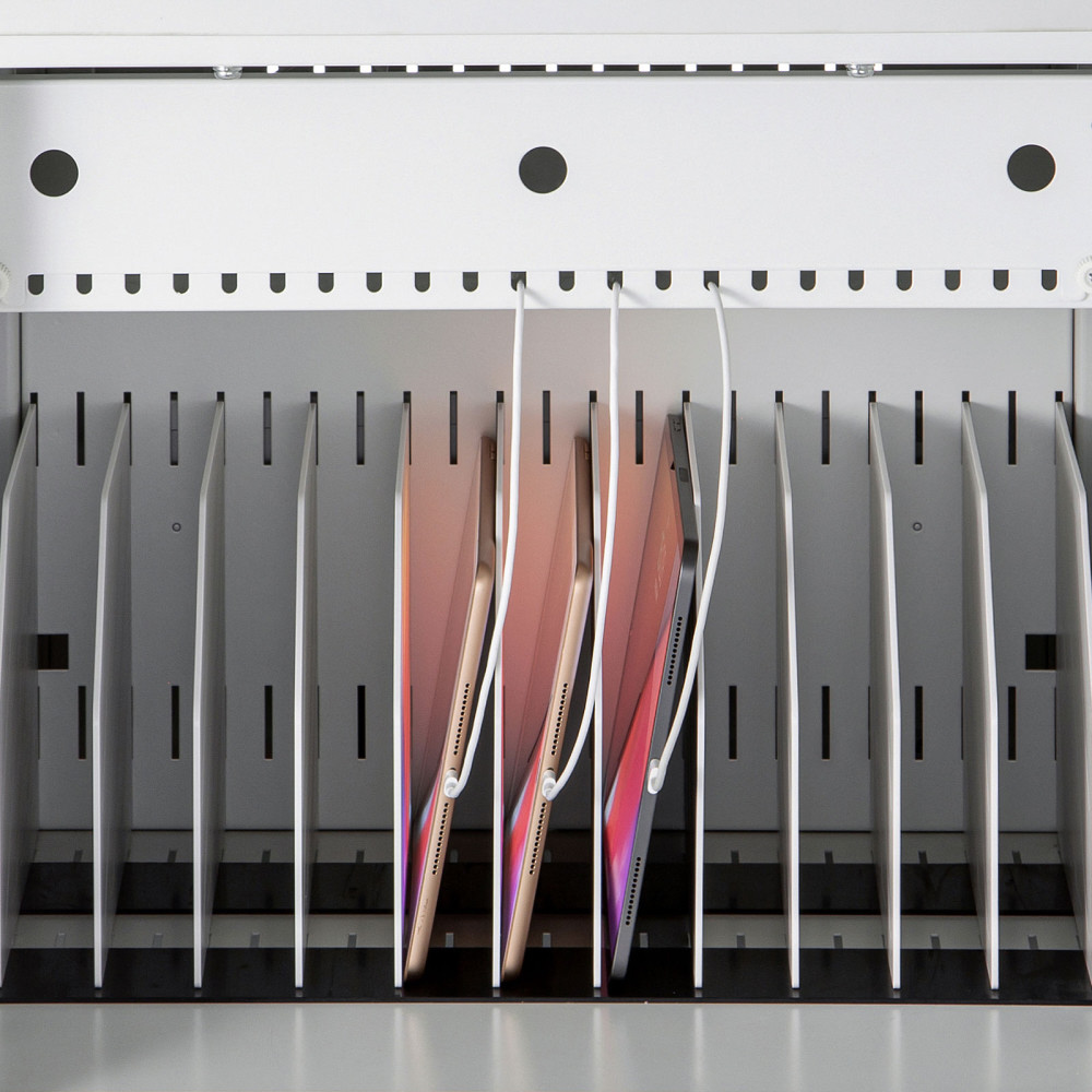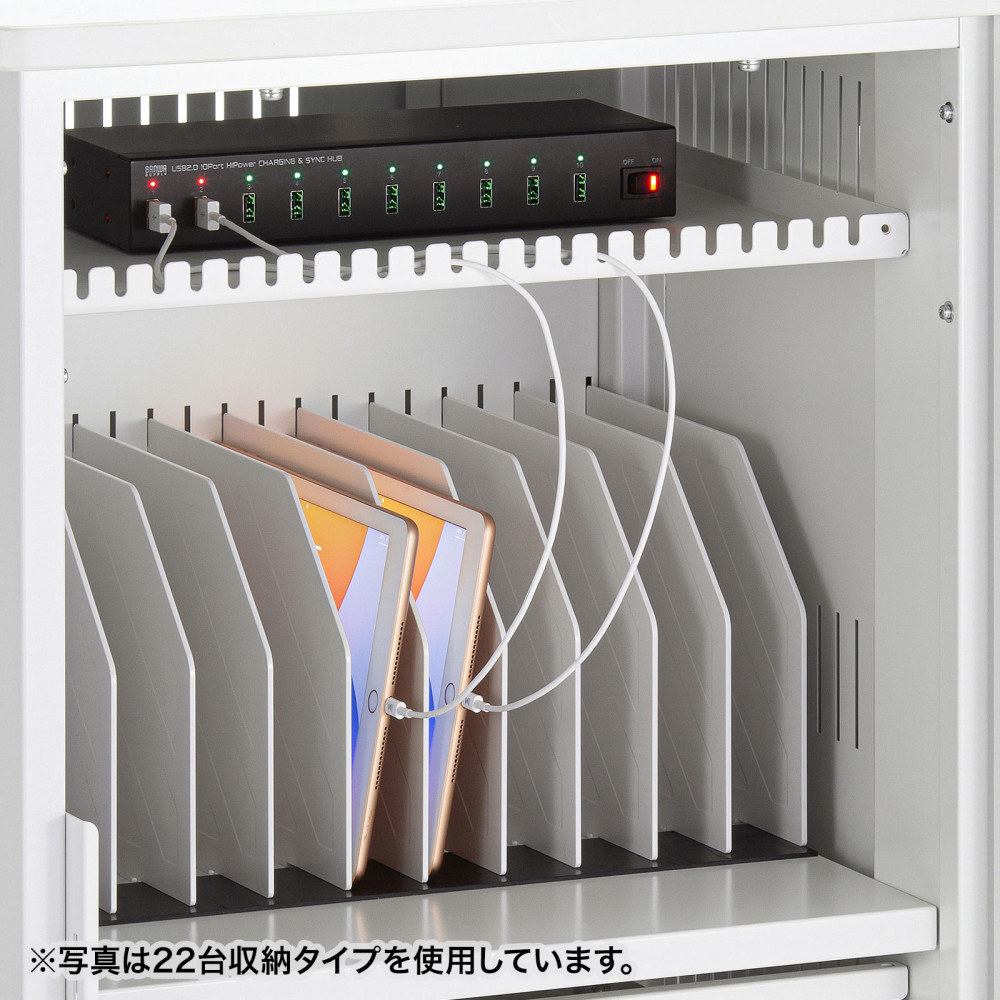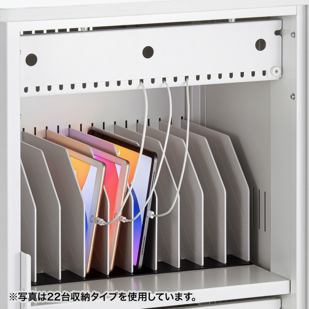 安全設計で配線もしやすい。14インチまでのタブレットを一括収納できる保管庫。窓なしタイプ。