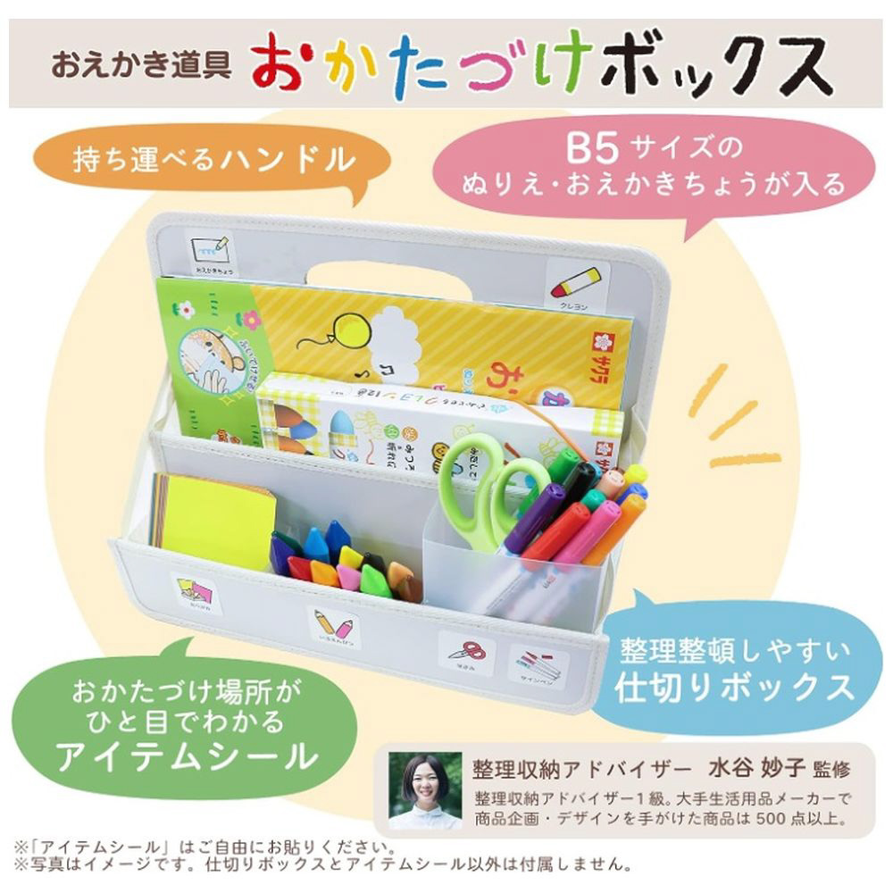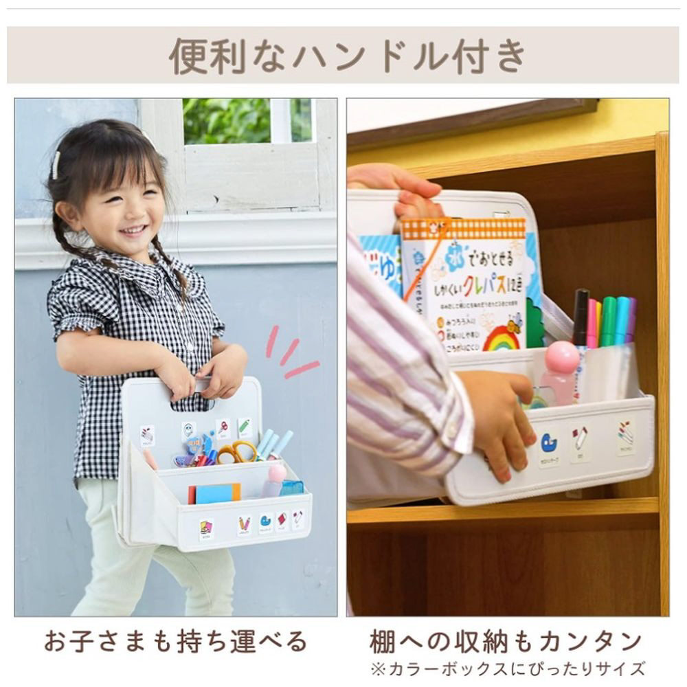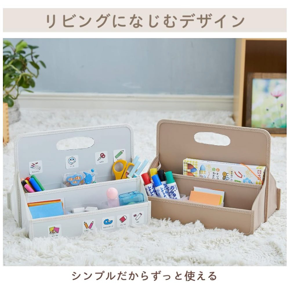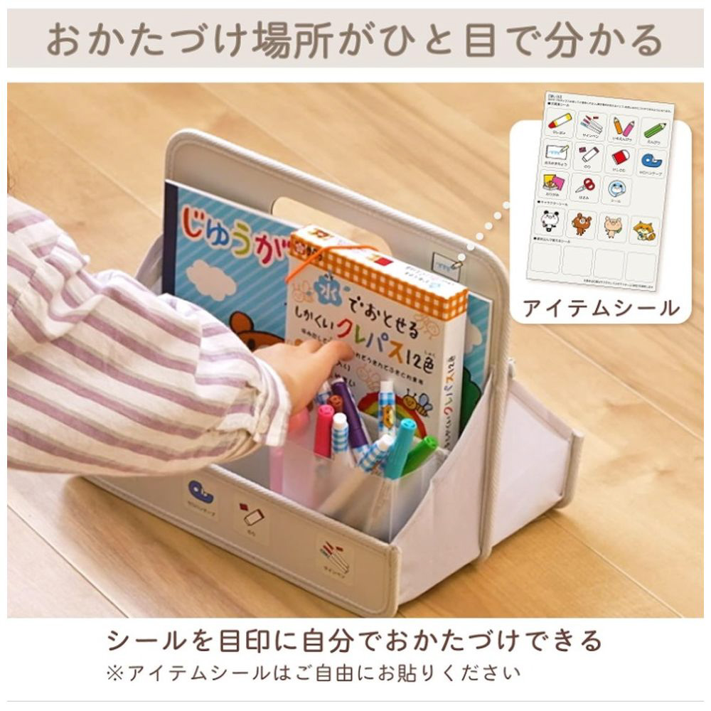 持ち運びやすいハンドル付きです。B5サイズのノートが収納できます。3種類の仕切りボックス付きなので、子供の成長に合わせて使い続けることができます。おかたづけ場所が一目でわかるシール付きです。リビングに馴染みやすいホワイト・モカの2色展開です。カラーボックスにちょうど入るサイズです。