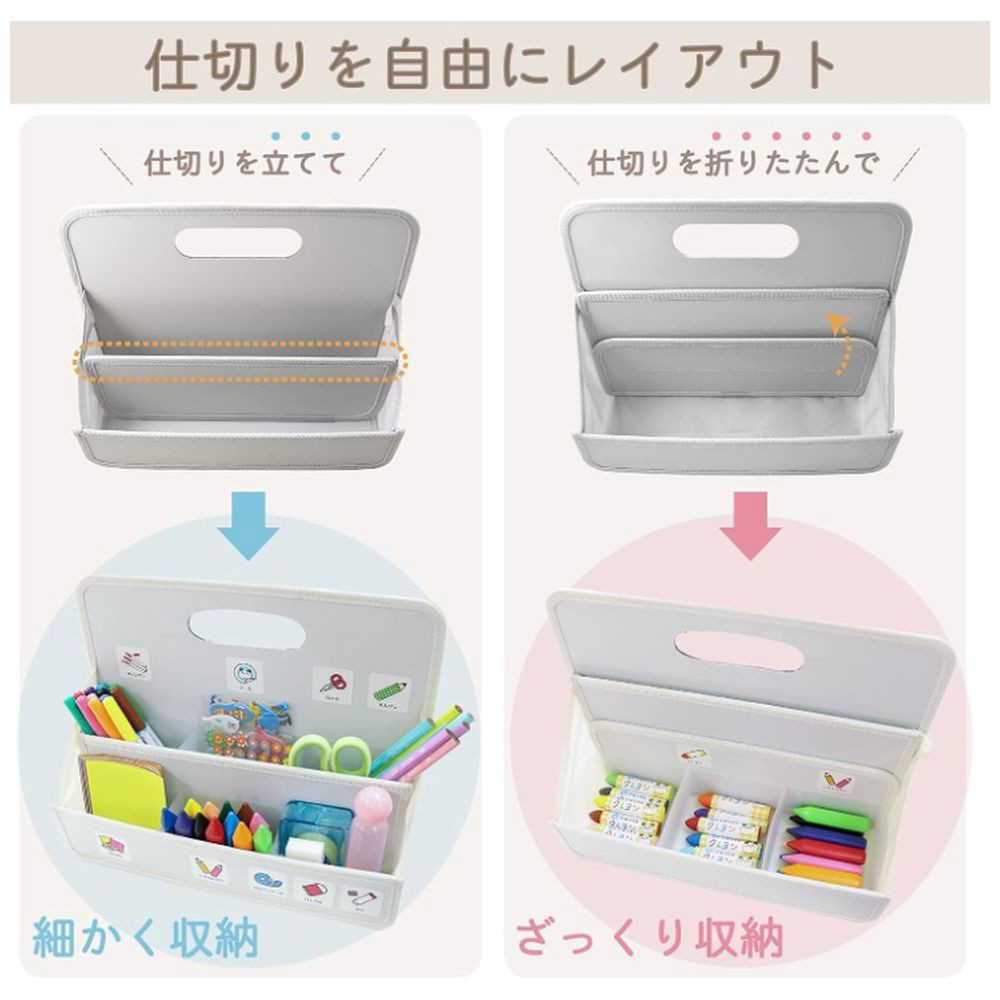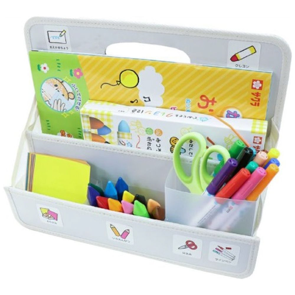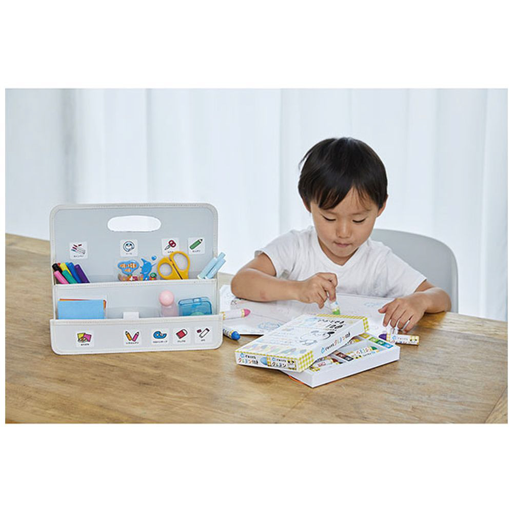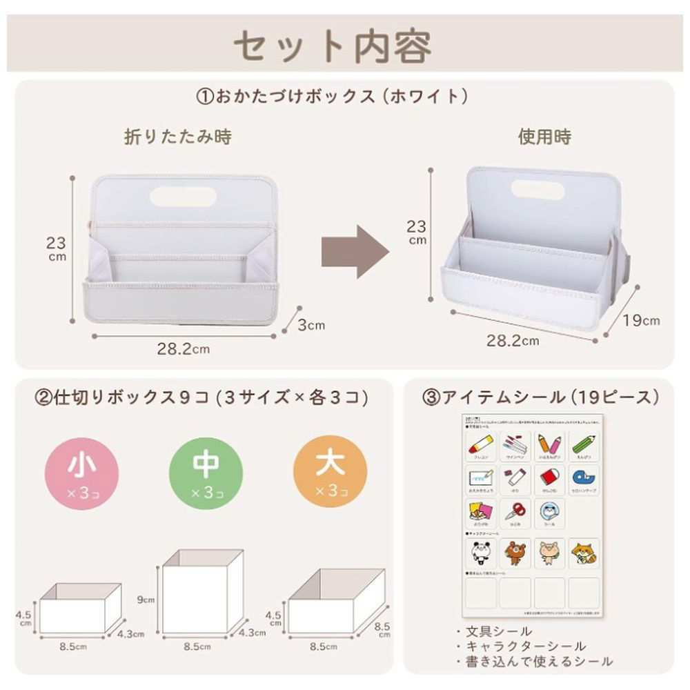 持ち運びやすいハンドル付きです。B5サイズのノートが収納できます。3種類の仕切りボックス付きなので、子供の成長に合わせて使い続けることができます。おかたづけ場所が一目でわかるシール付きです。リビングに馴染みやすいホワイト・モカの2色展開です。カラーボックスにちょうど入るサイズです。