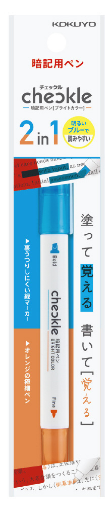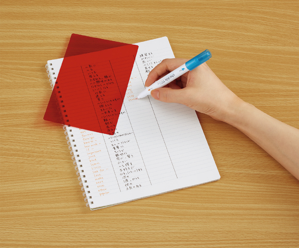 文字の上から塗る青色のマーカーと、文字を書き込むオレンジ色のペンが1つになった暗記用ペンです。どちらも赤いシートを被せれば隠れます。青色は普段使いのマーカーとしてもおすすめです。
