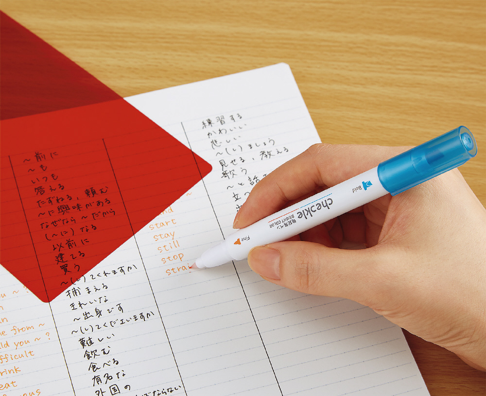 ●1本2役/文字の上から塗る青色のマーカーと、文字を書き込むオレンジ色のペンが1つになった暗記用ペンです。どちらも赤いシートを被せれば隠れるので、効率よく暗記学習できます。